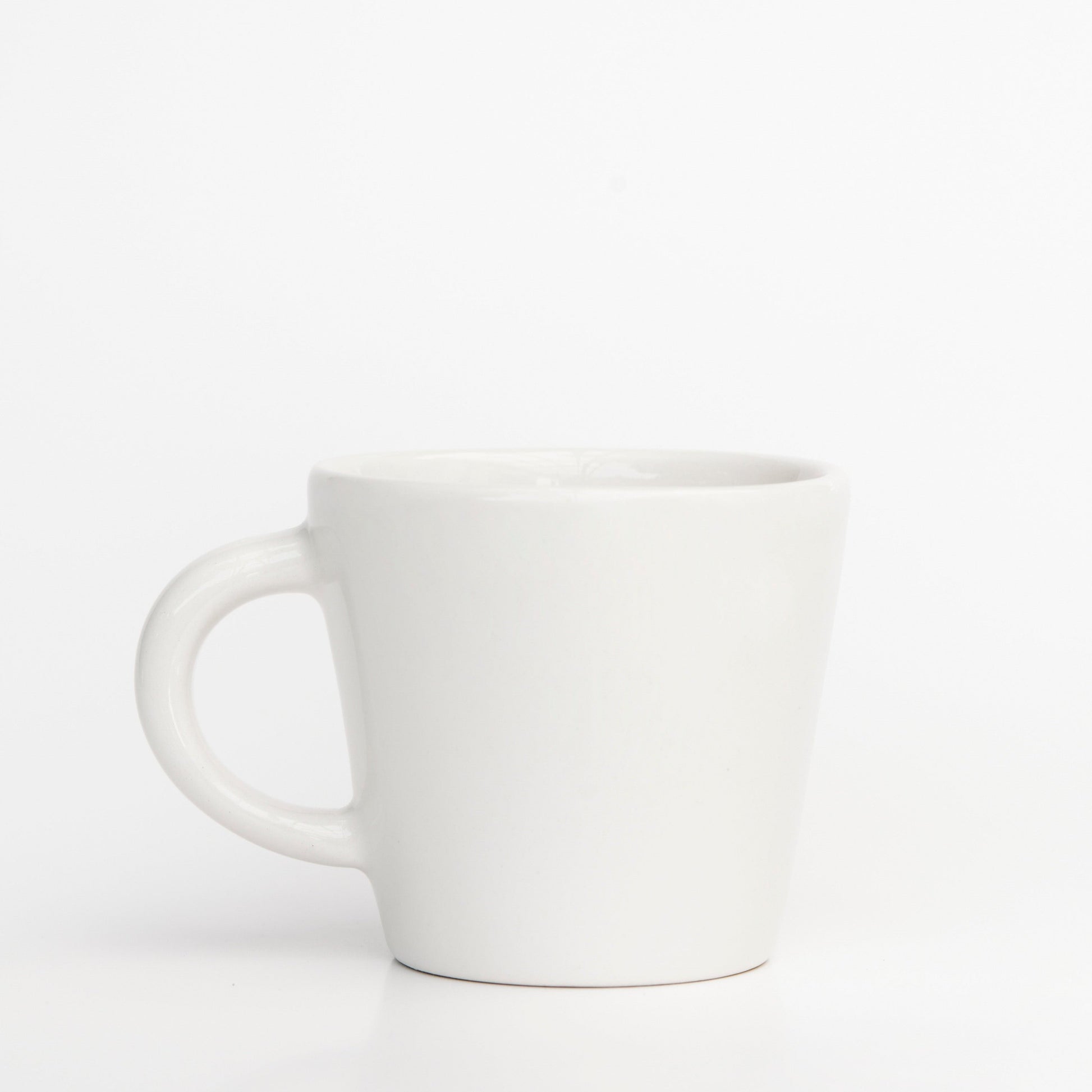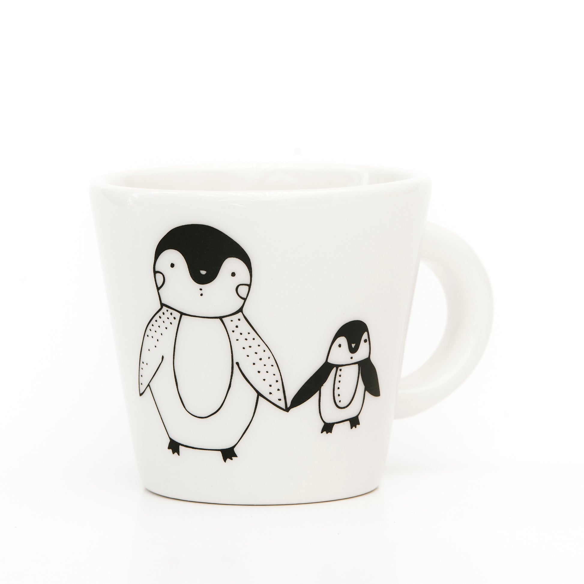 Small cup with an illustration of a penguin parent holding hand of child. Handmade in Cape Town, South Africa, it adds a unique touch to your table. Perfect for enjoying your favourite beverage with a hint of African flair.