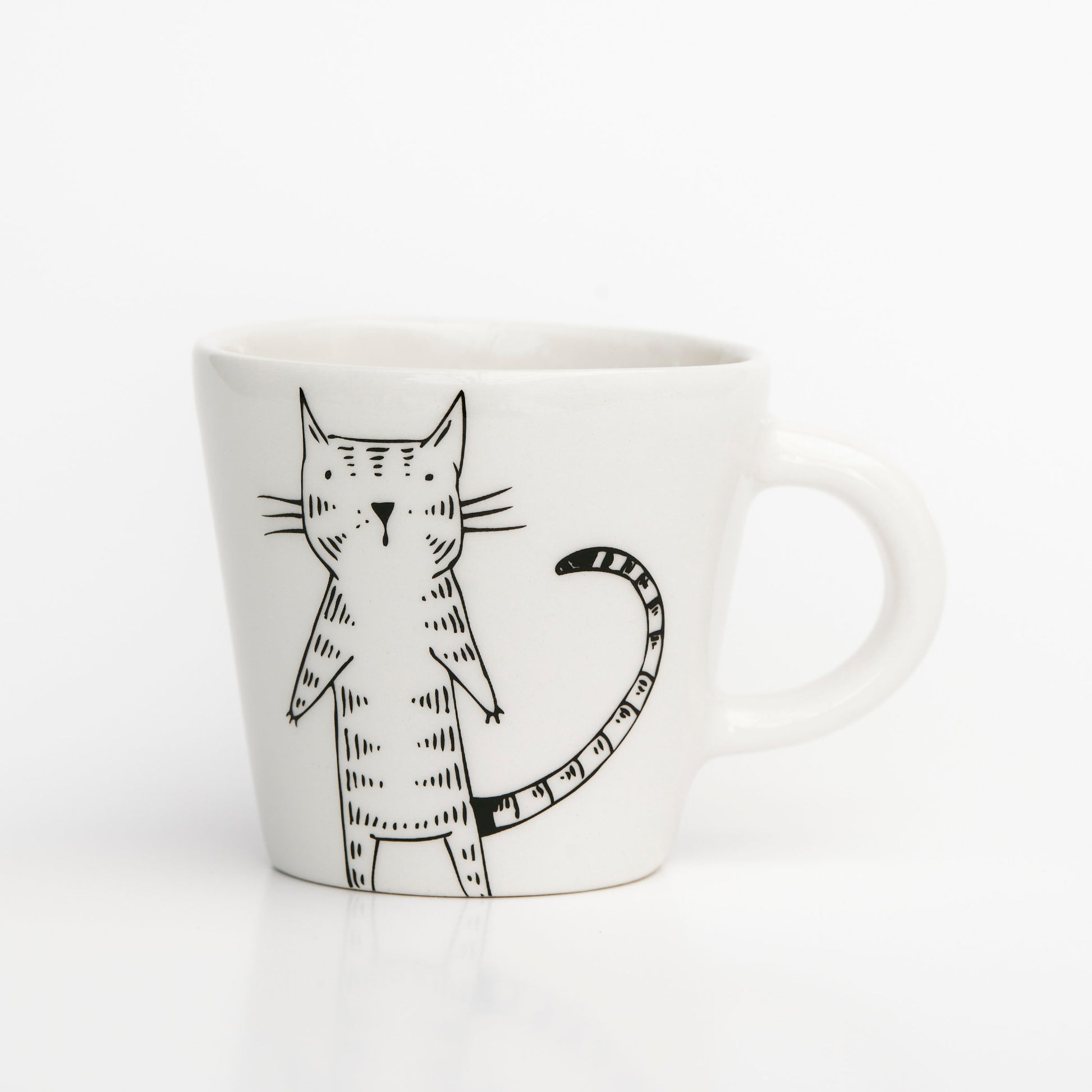 Small cup with a whimsical illustration of a cat standing. Handmade in Cape Town, South Africa, it adds a playful charm to your drinkware collection. Perfect for enjoying a cozy drink with a touch of feline whimsy.