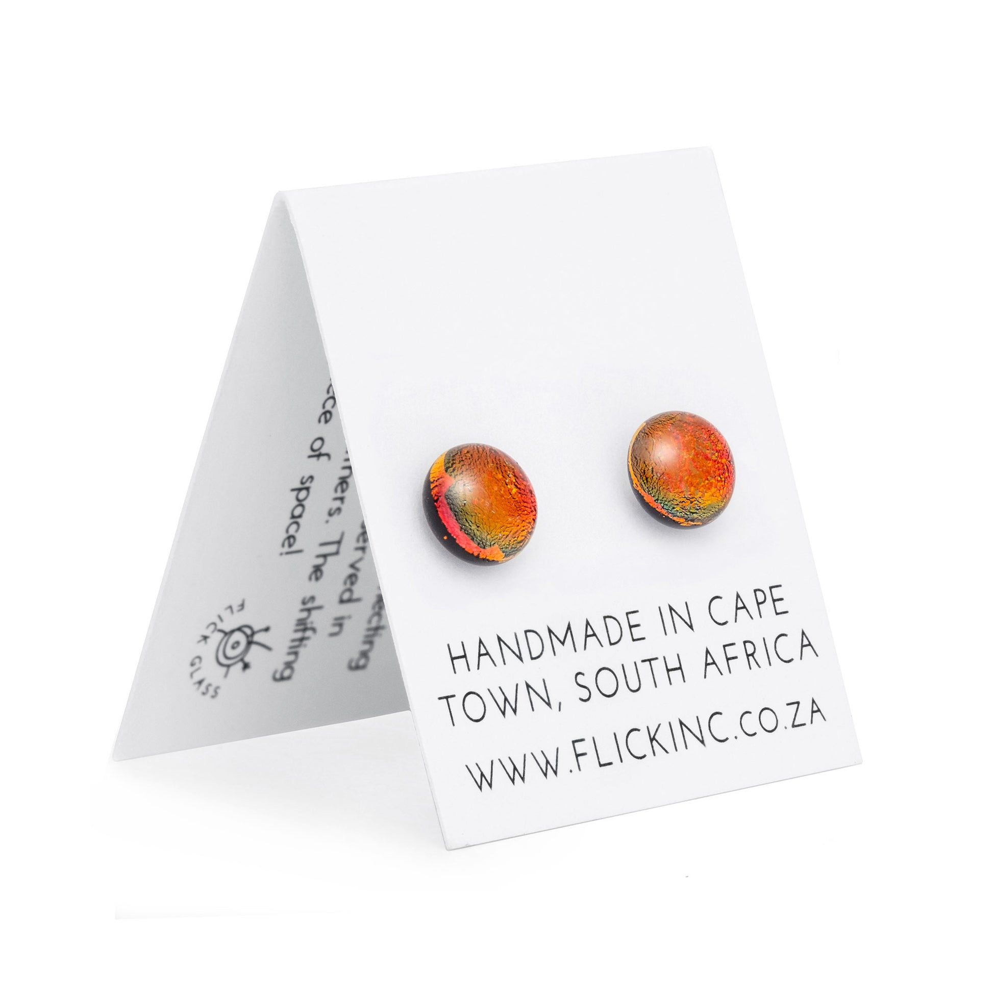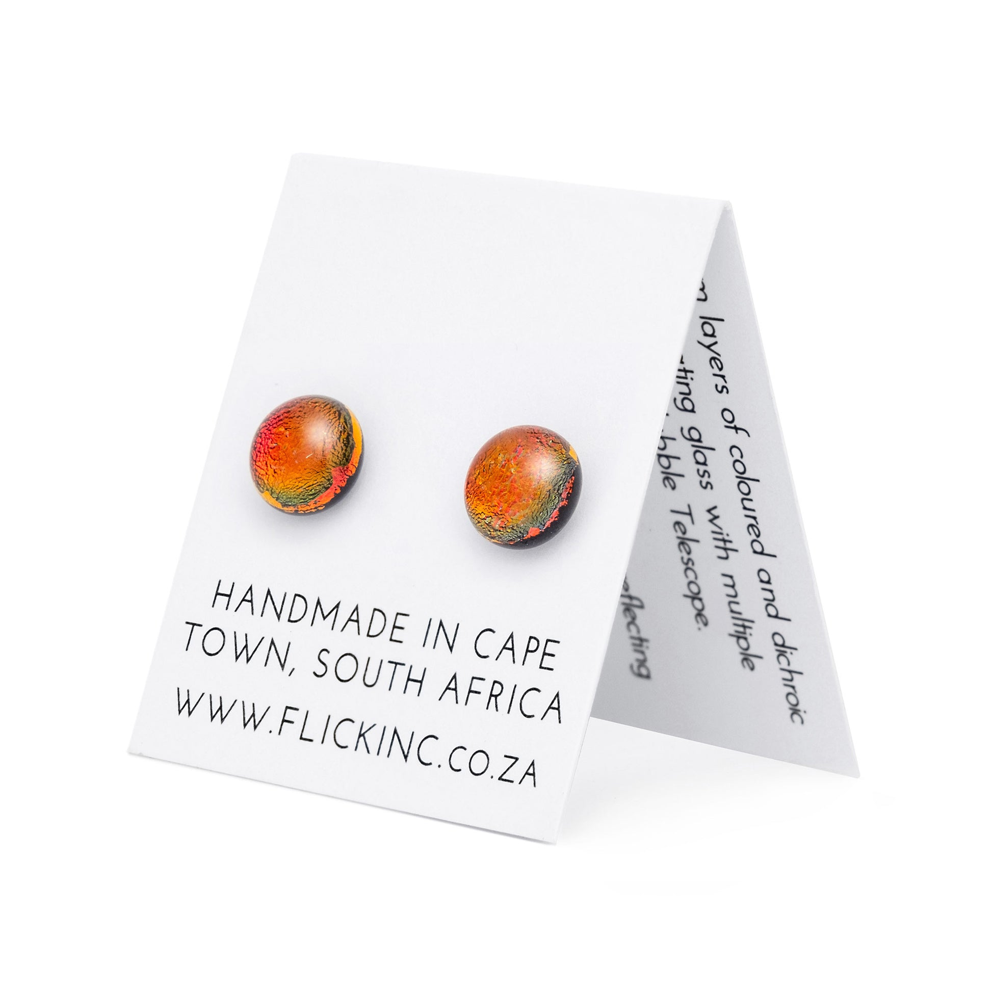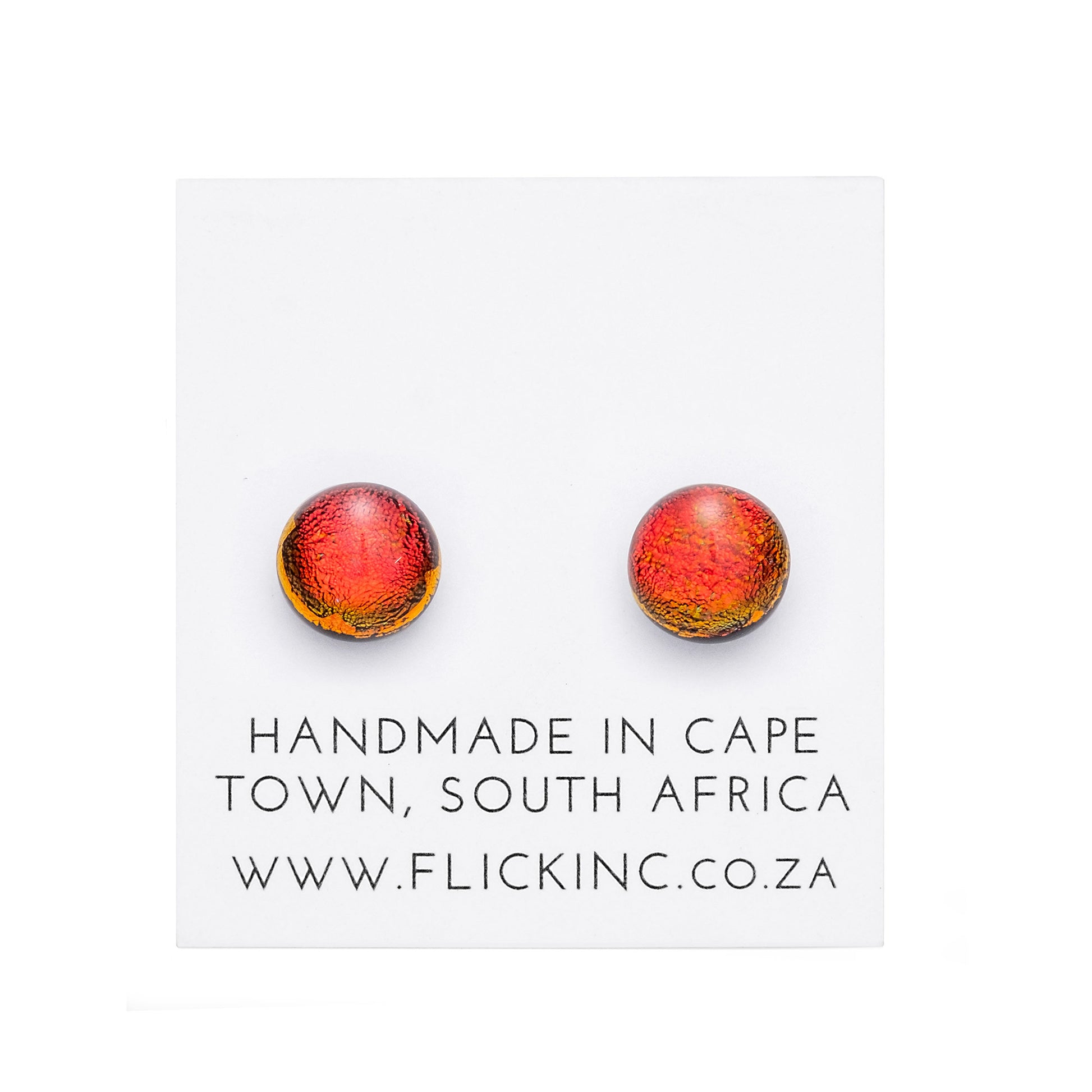 These handmade sunset ember stud earrings use dichroic glass for a soft color shift. The round design features warm orange-red tones with subtle green and black accents, like a quiet flame, making them lightweight and comfortable for daily wear. Crafted in Cape Town, South Africa, with sterling silver posts gentle on sensitive ears, they bring a cozy glow without excess.