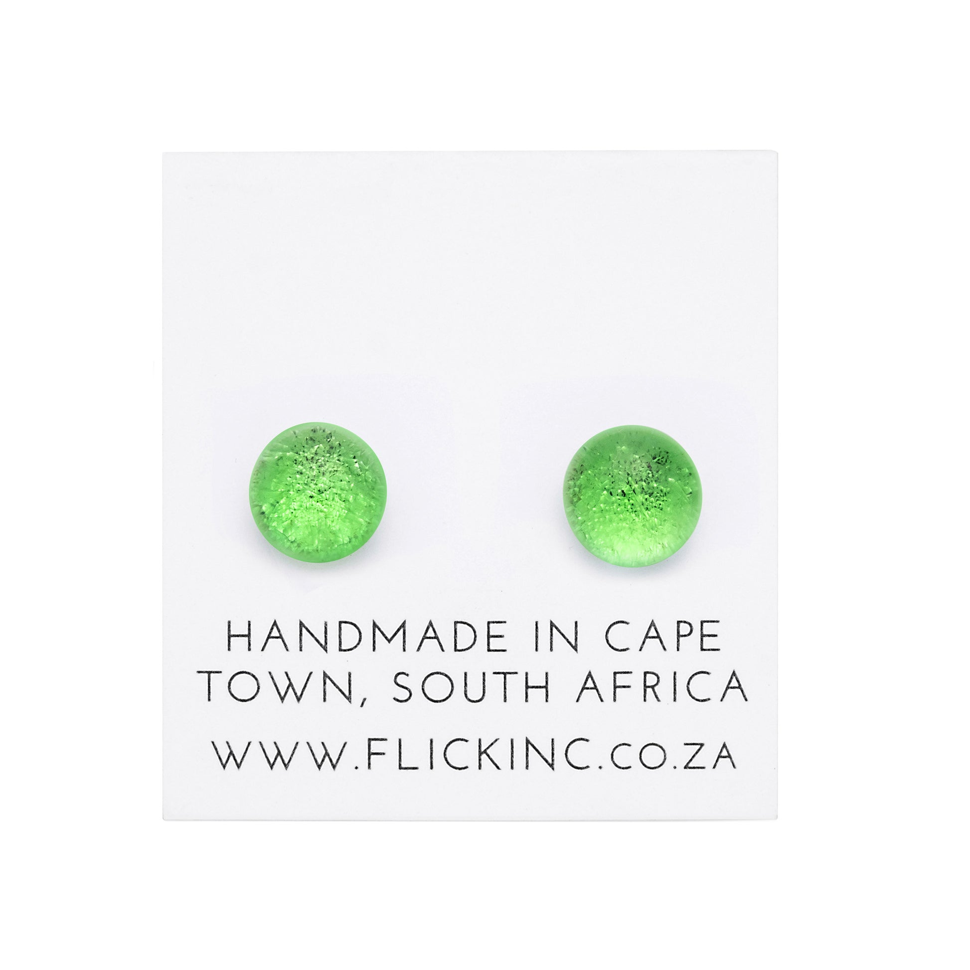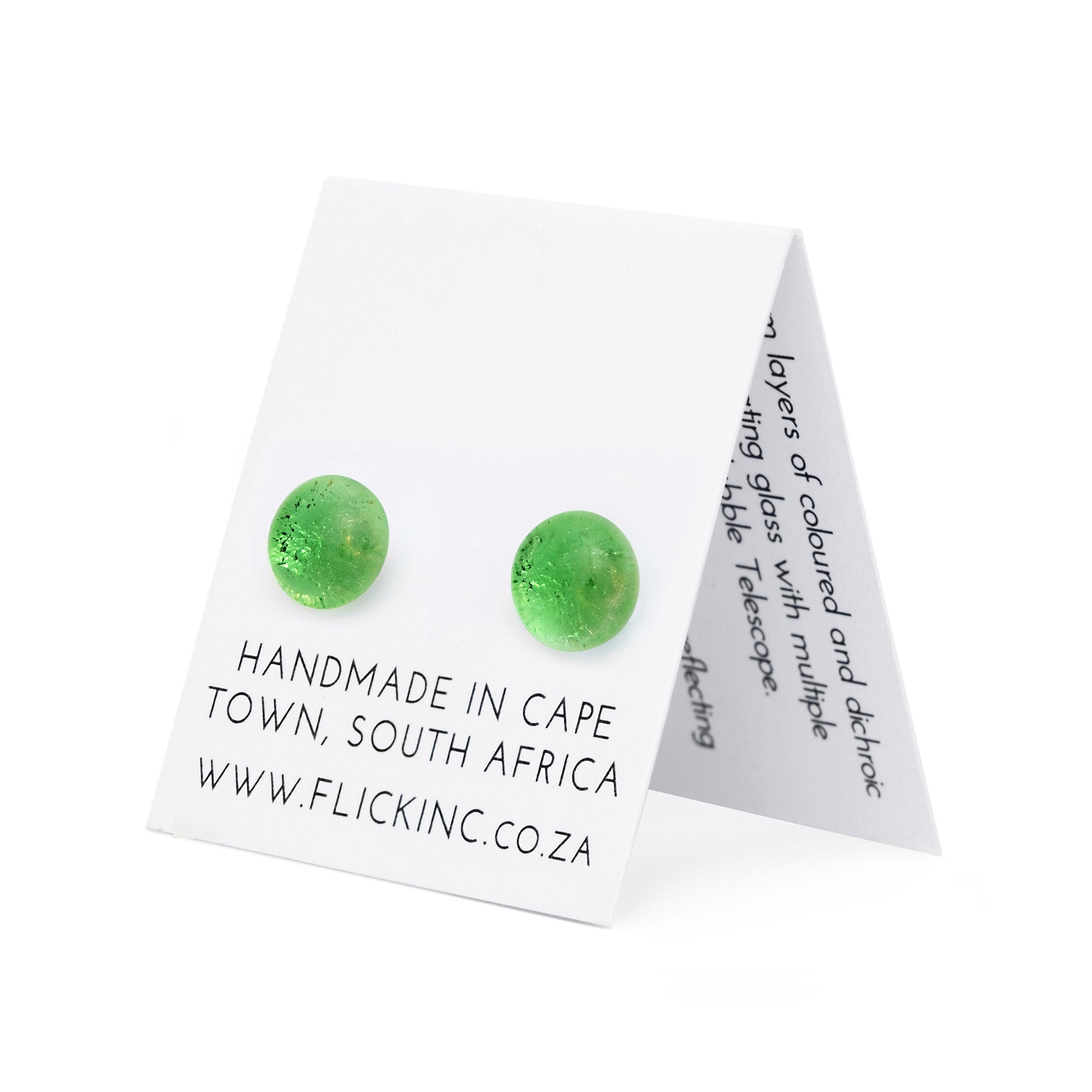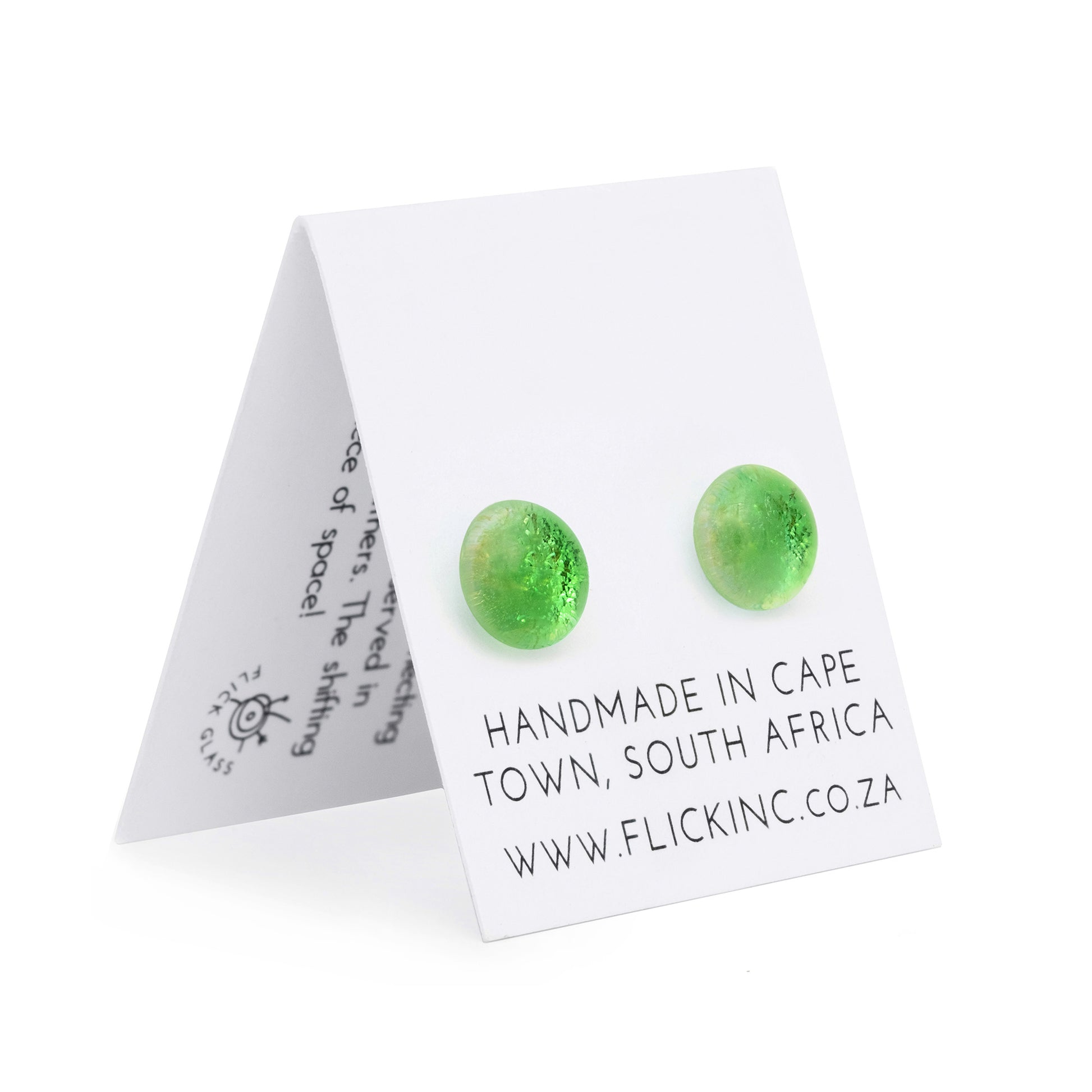 These handmade green sparkle stud earrings feature dichroic glass with a textured surface for subtle shine. The round, bright green design has fine frosty details, making them lightweight and comfortable for daily wear. Crafted in Cape Town, South Africa, with sterling silver posts gentle on sensitive ears, they add a fresh touch without fuss.