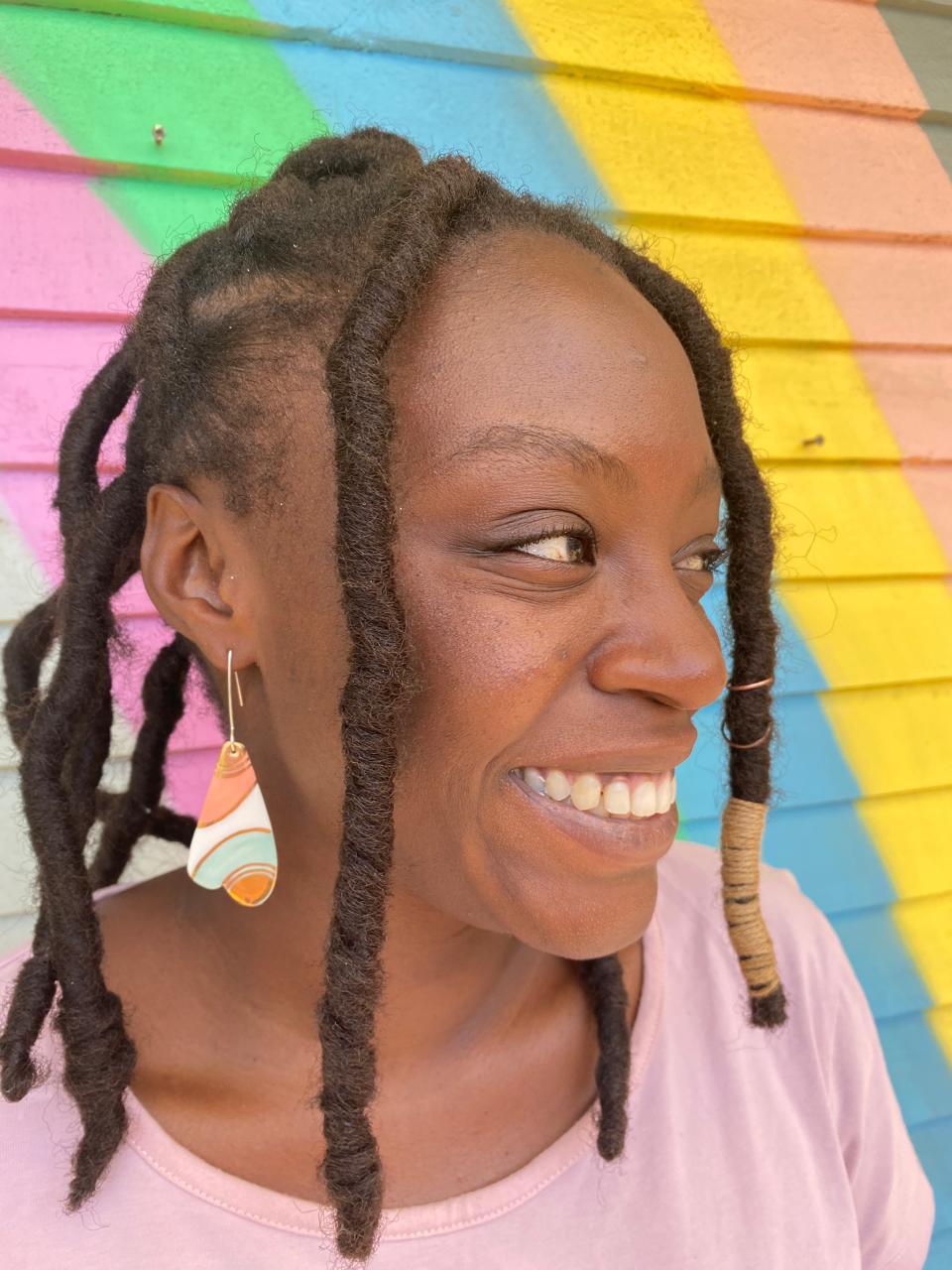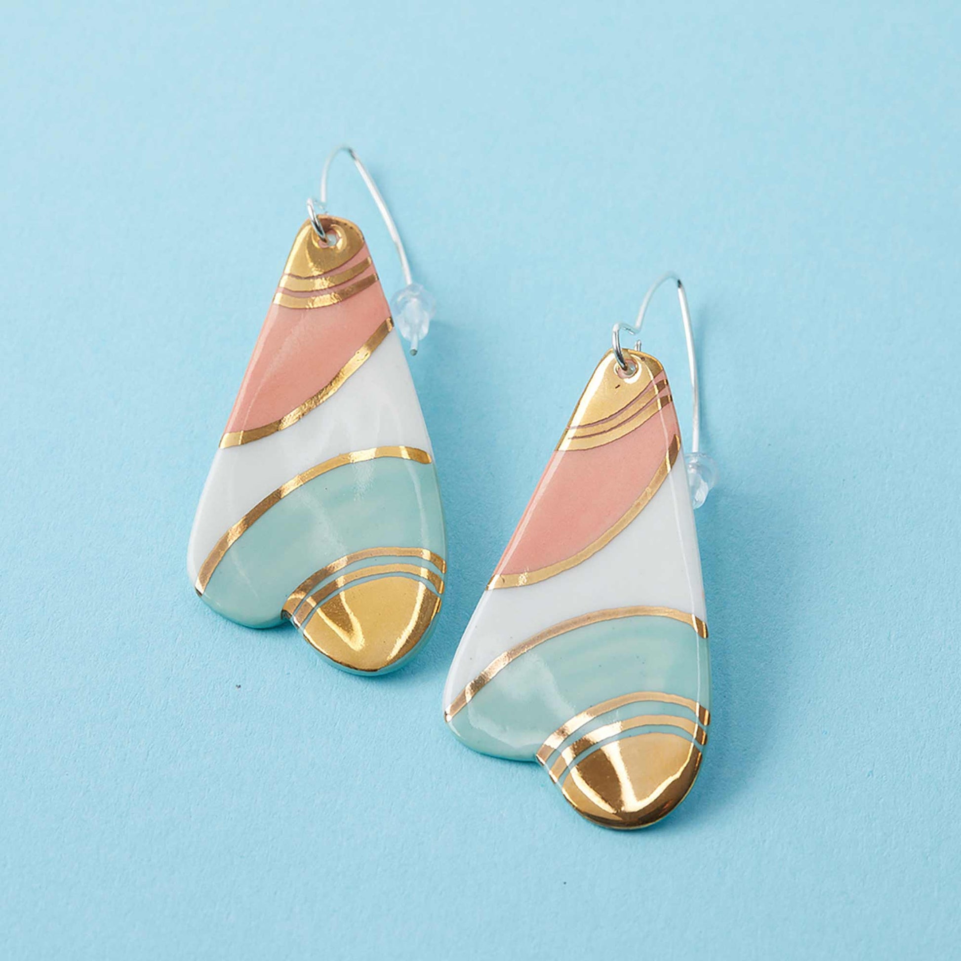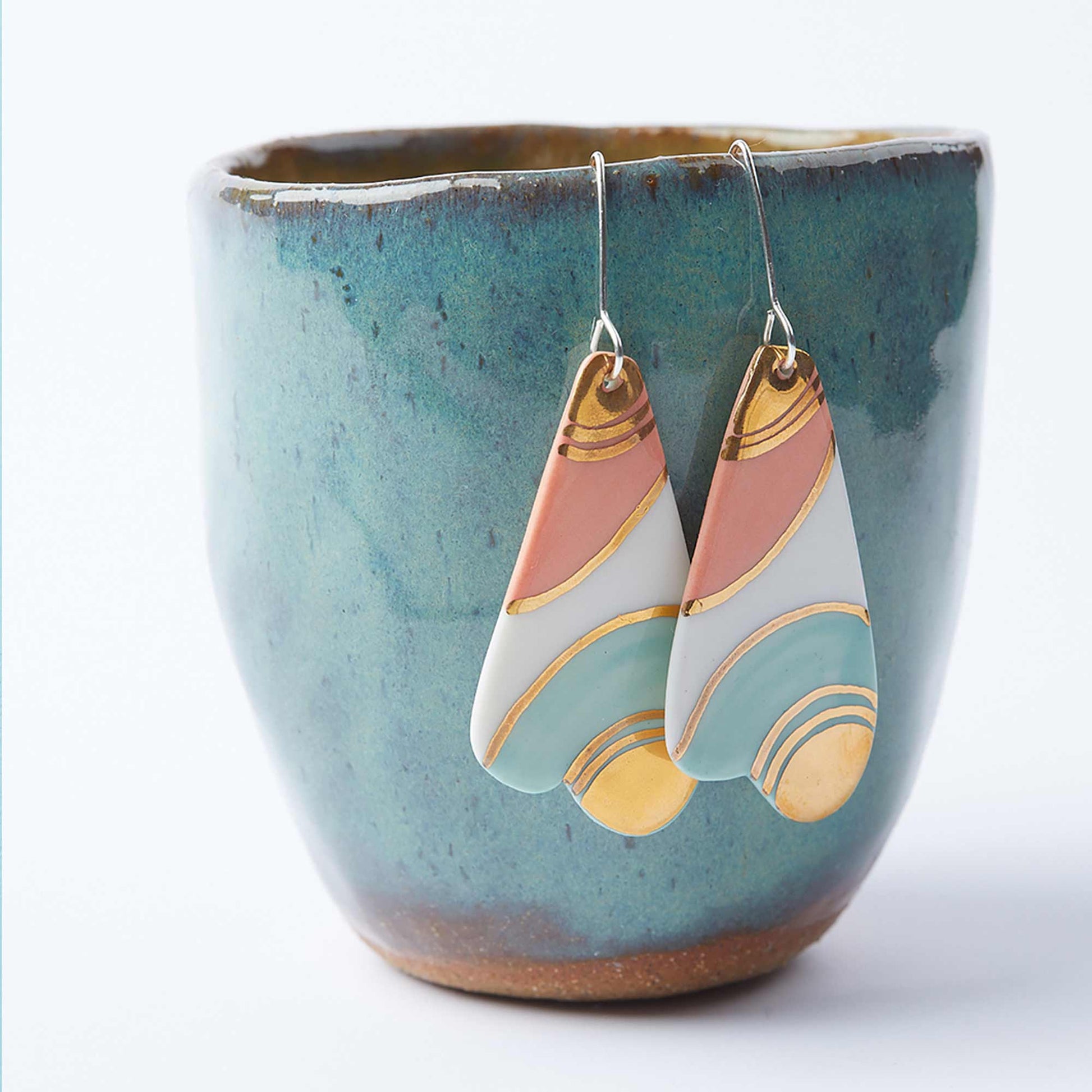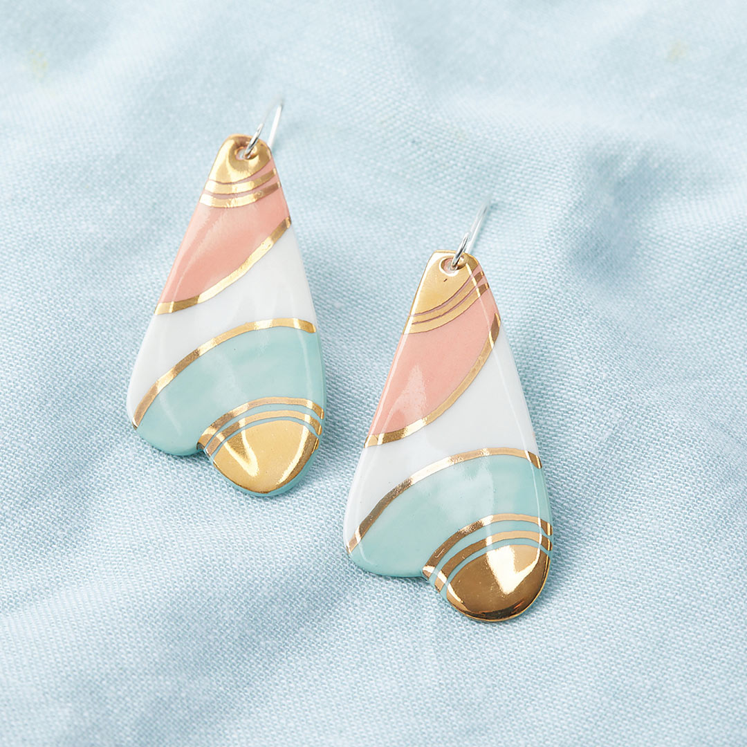 Add a touch of color to your look with these Golden Hour Drop earrings. The porcelain is decorated with a hand-drawn pattern in a mix of salmon, mint green, and gold. Handmade in Cape Town, South Africa, they have a comfortable drop shape that works with any style.
