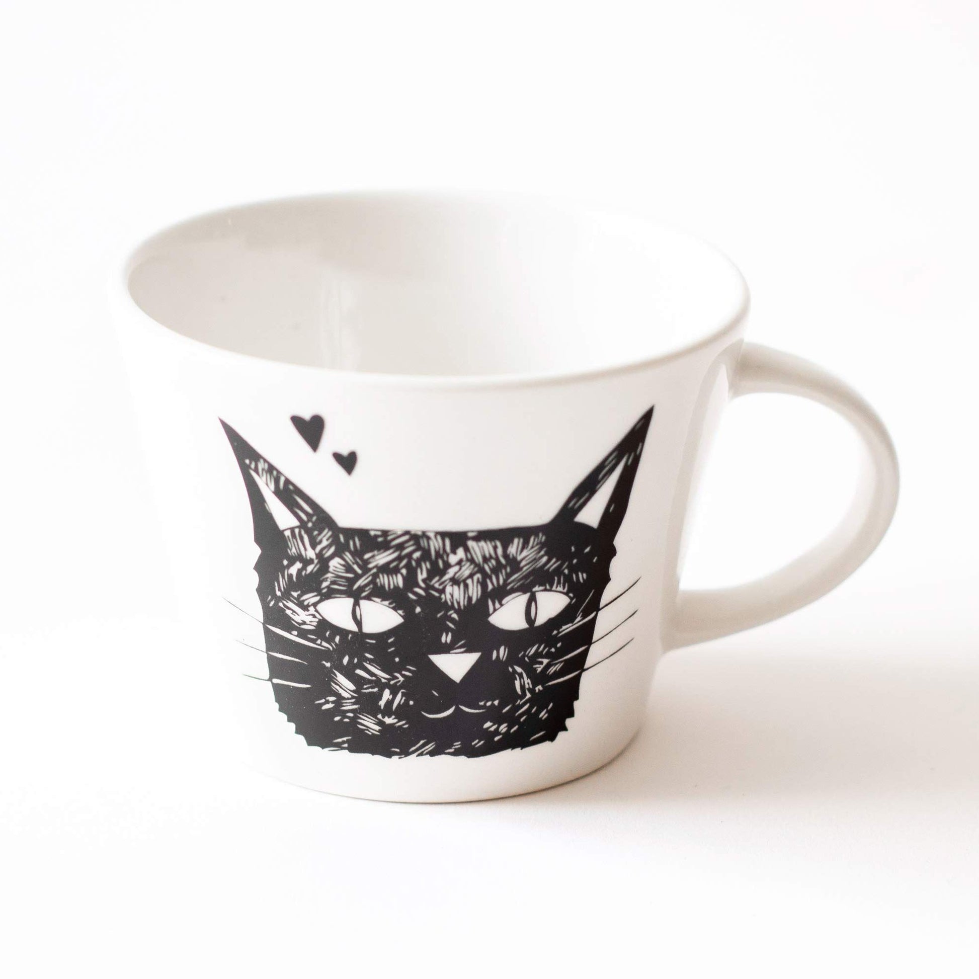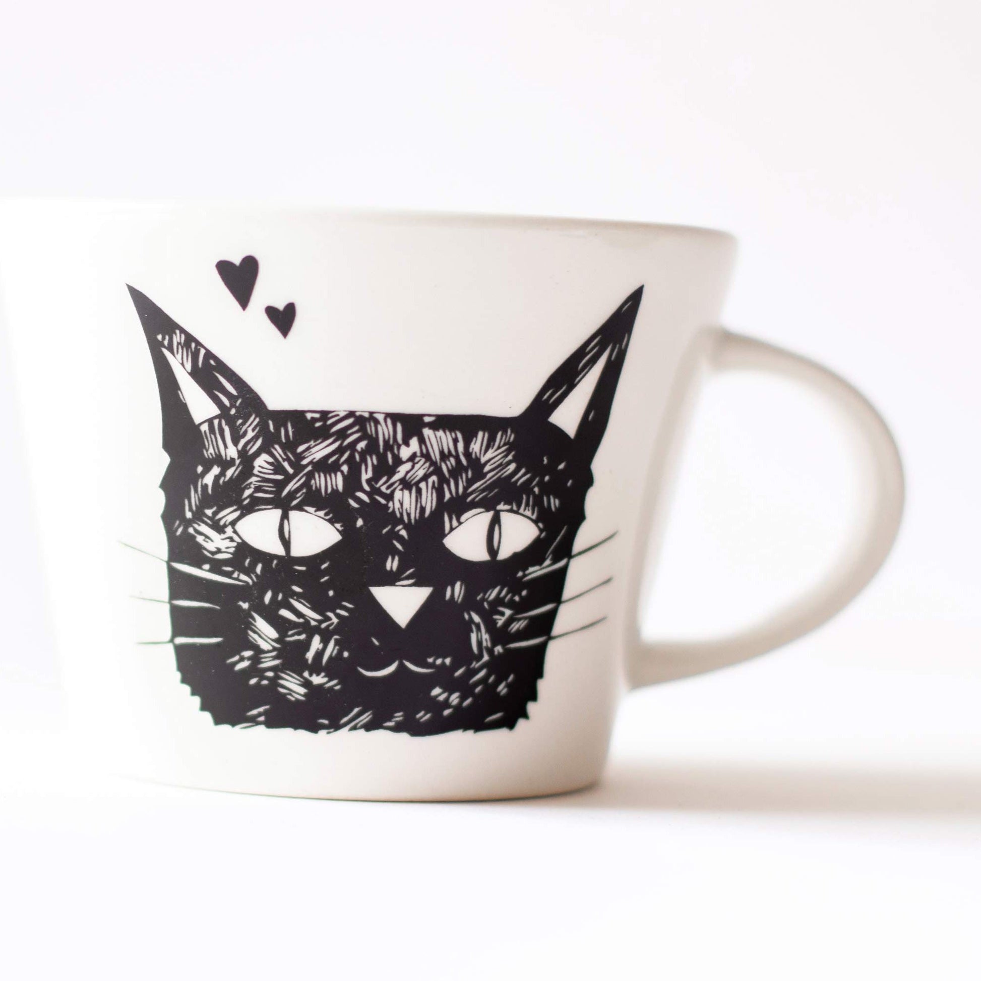Large Ceramic Cup with a hand-drawn black cat illustration. Crafted by hand in Cape Town, South Africa, this item enhances your table with a unique flair. Inspired by South Africa's wildlife, it combines functionality with whimsical design, bringing joy to your daily routine and making every drink special.
