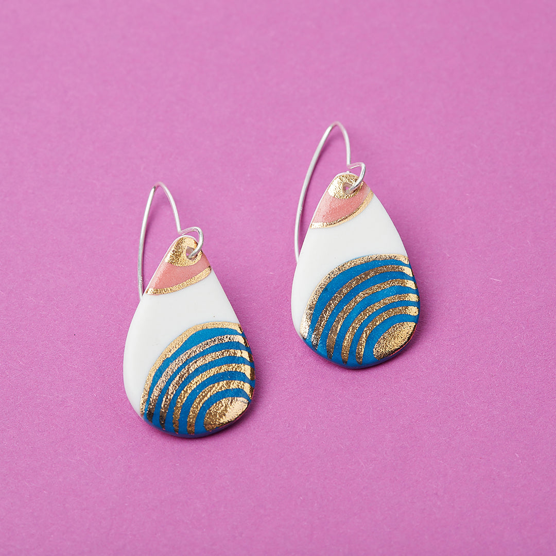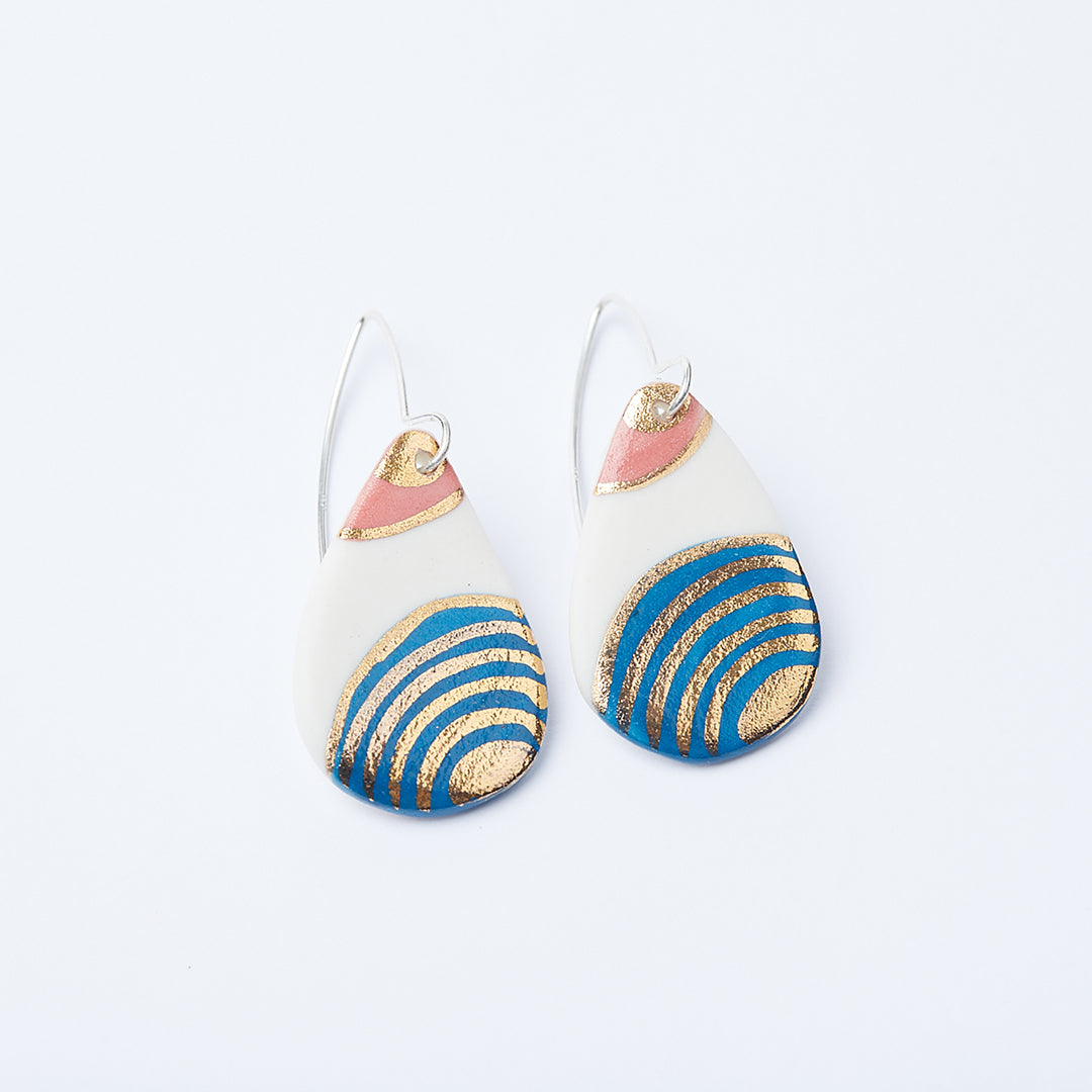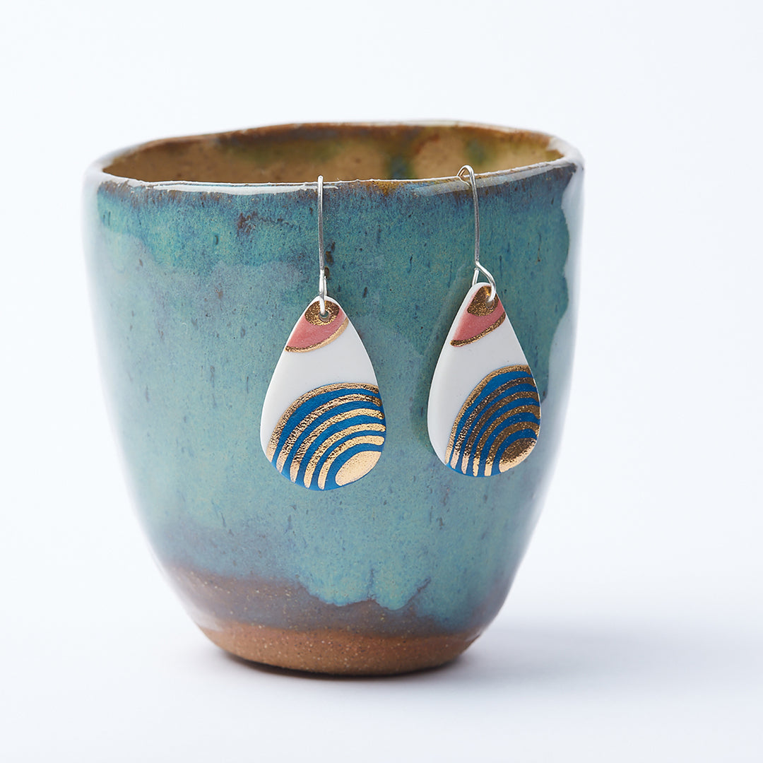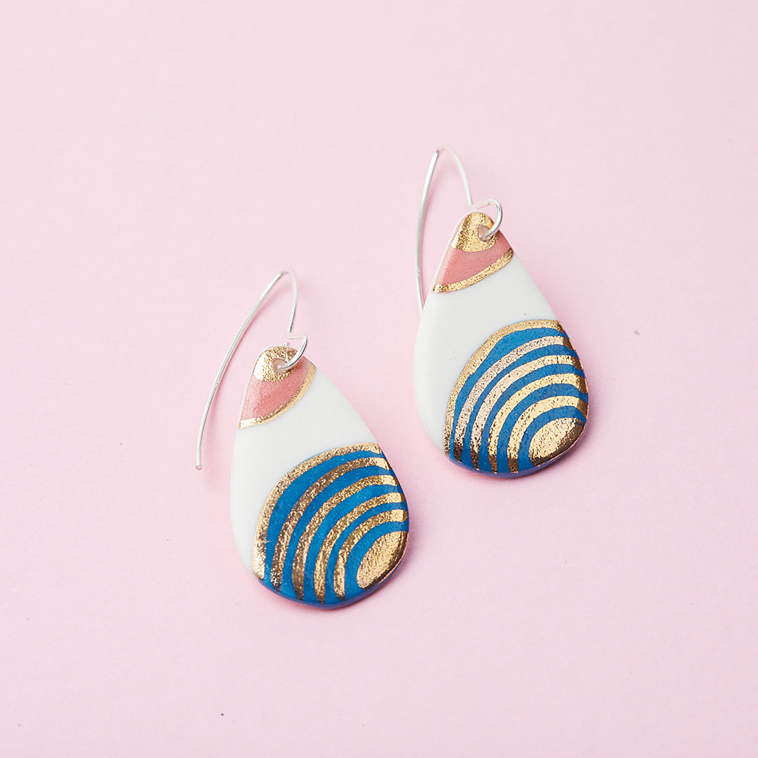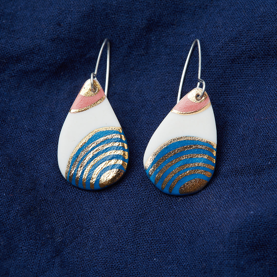 Elevate your style with the Dreamy Amrita dangle earrings, featuring a delicate hand-drawn illustration in blue, pink, and gold, inspired by the mythical drop of amrita. Shaped in a graceful drop design, these porcelain earrings are handmade in Cape Town, South Africa, adding a touch of spiritual depth and whimsy to any outfit.