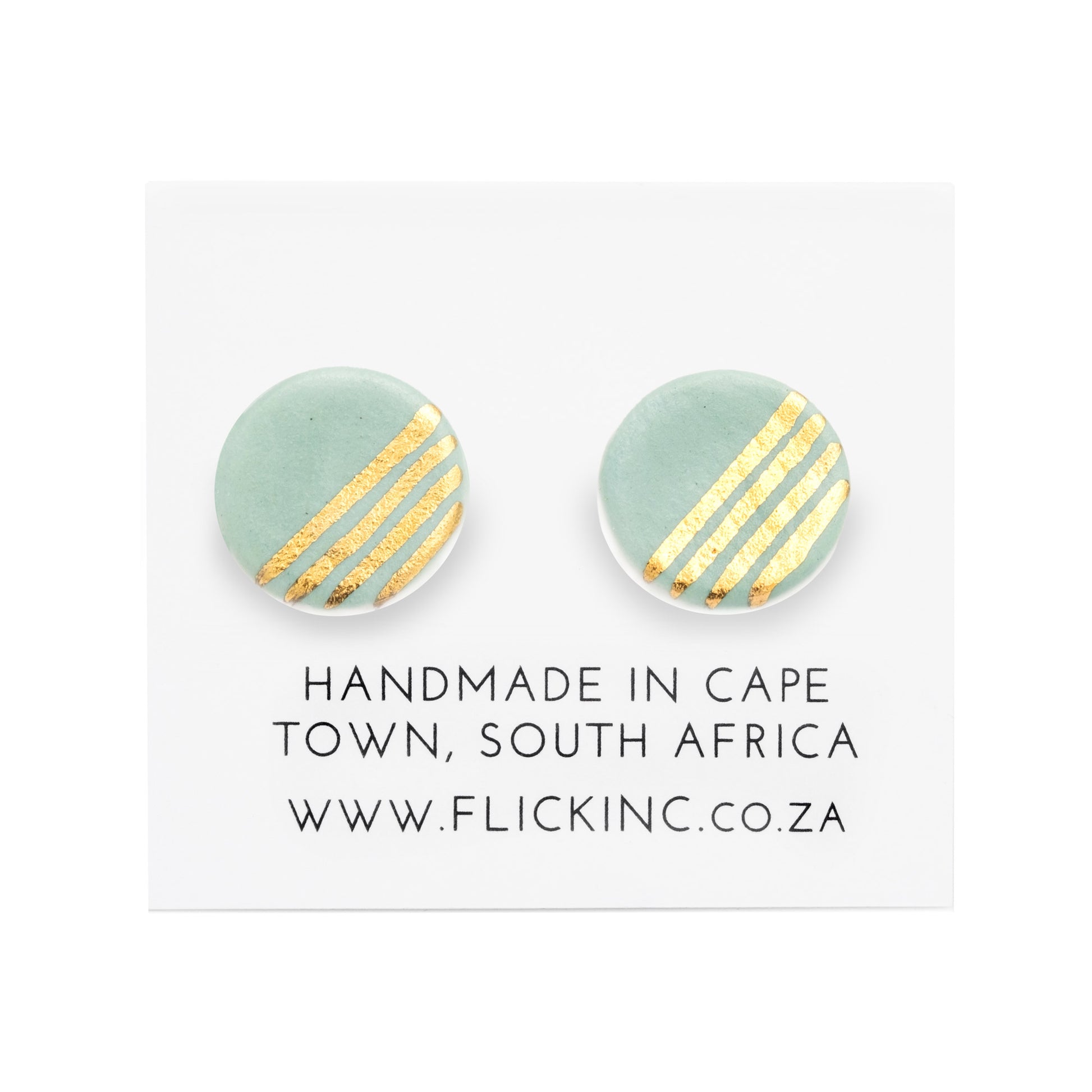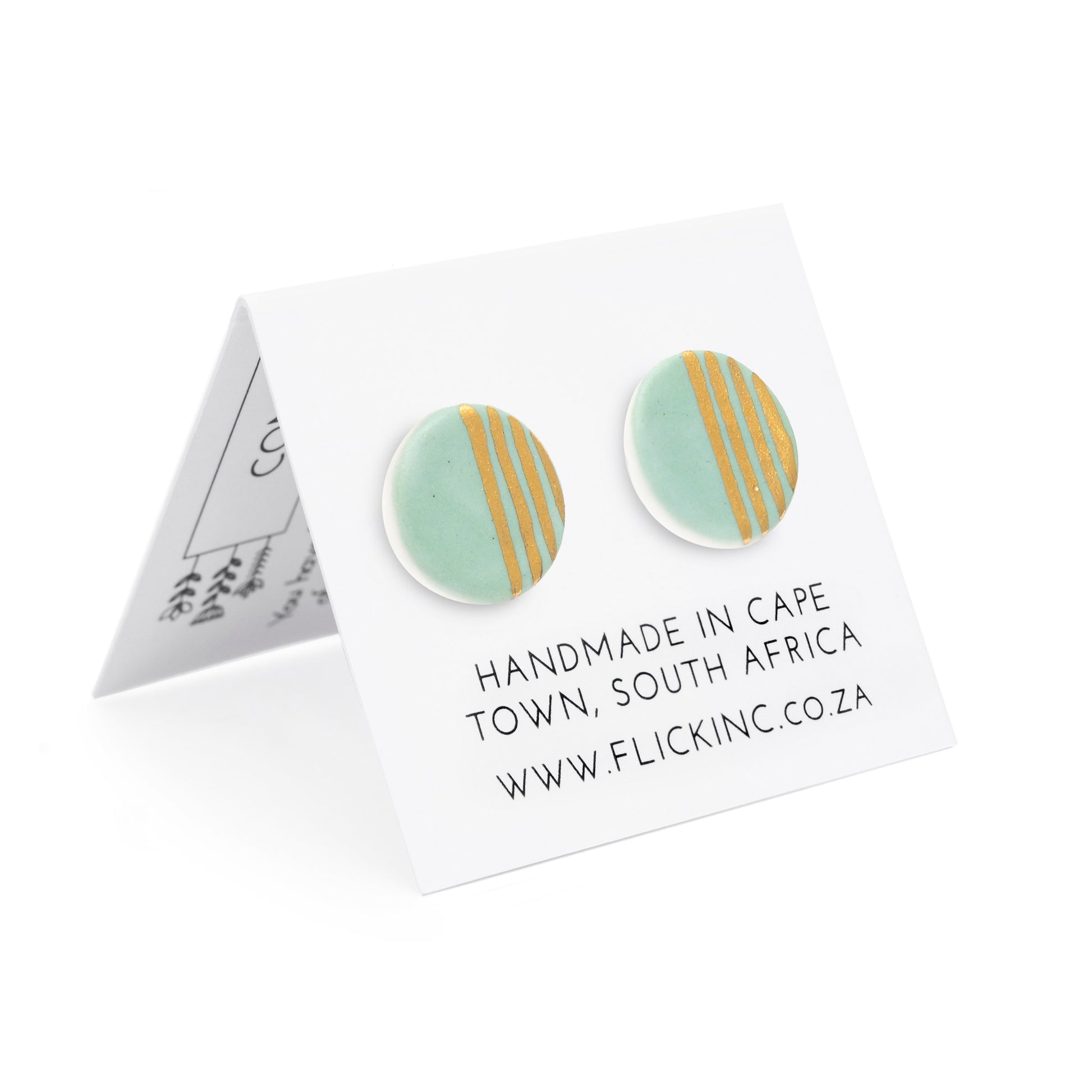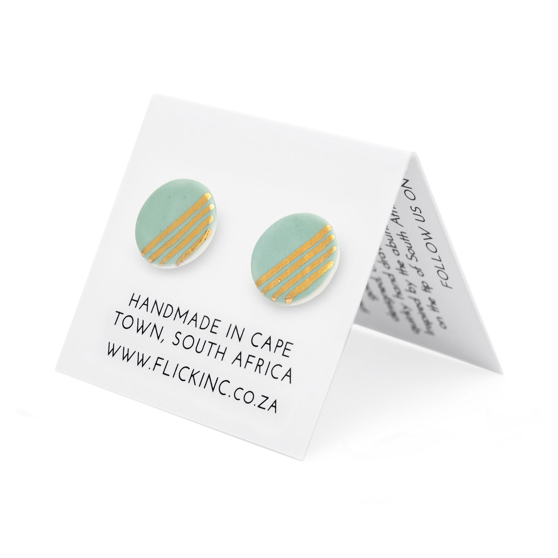 Our Golden Moon Reflection studs are crafted from hand-rolled white porcelain. Against a beautiful sea blue glaze, hand-painted 22kt gold luster creates delicate stripes that evoke the tranquil look of golden moonlight reflecting on the ocean surface. These earrings offer a subtle yet distinct addition to your collection.
