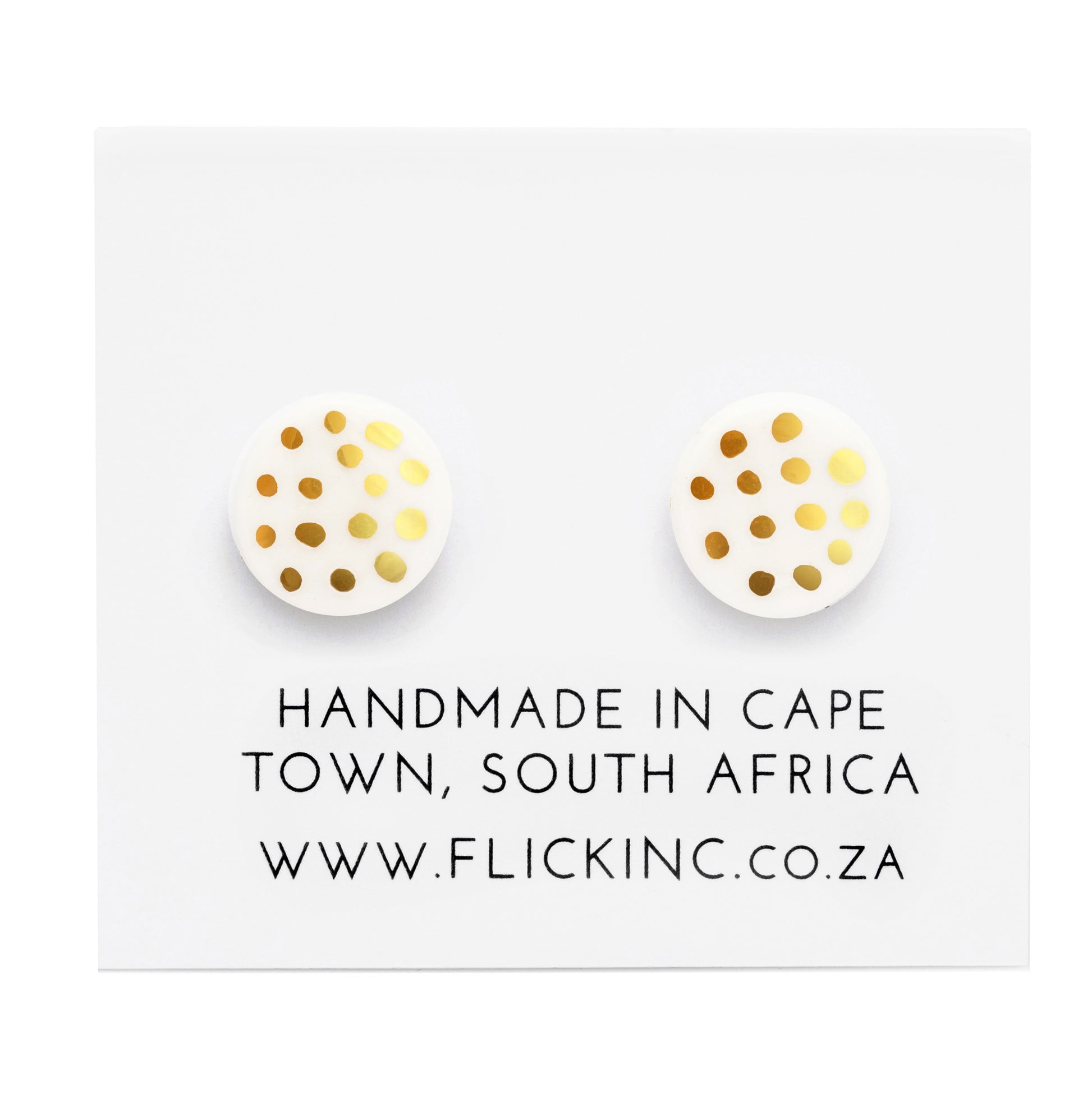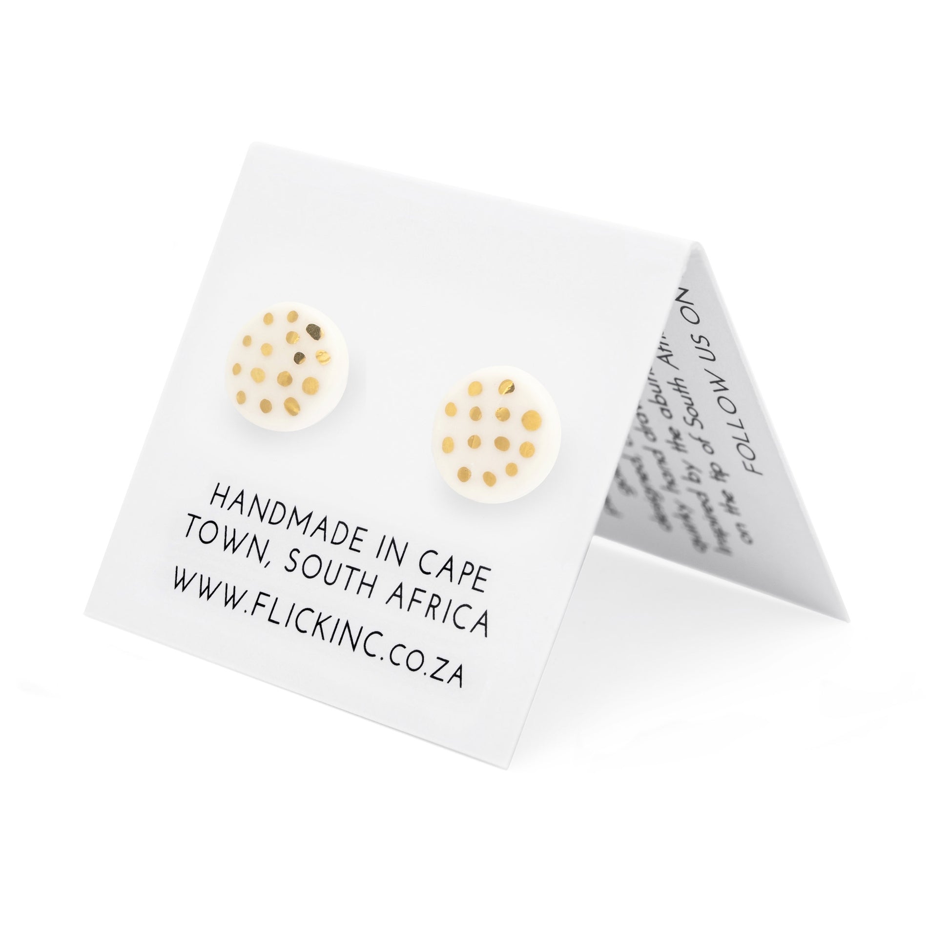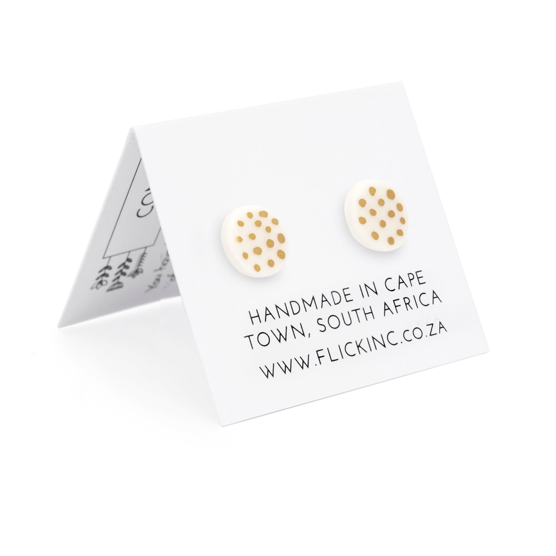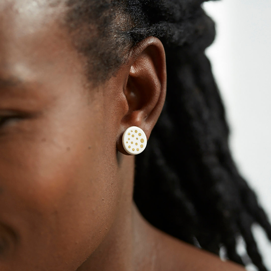 Our Gold Dots studs are crafted from white porcelain, meticulously hand-rolled, cut, and fired. Each earring is adorned with hand-painted fine glaze and 22kt gold luster gold dots. Perfect for adding a distinctive and sophisticated touch to any outfit, the Gold Dots studs offer a timeless yet contemporary style.