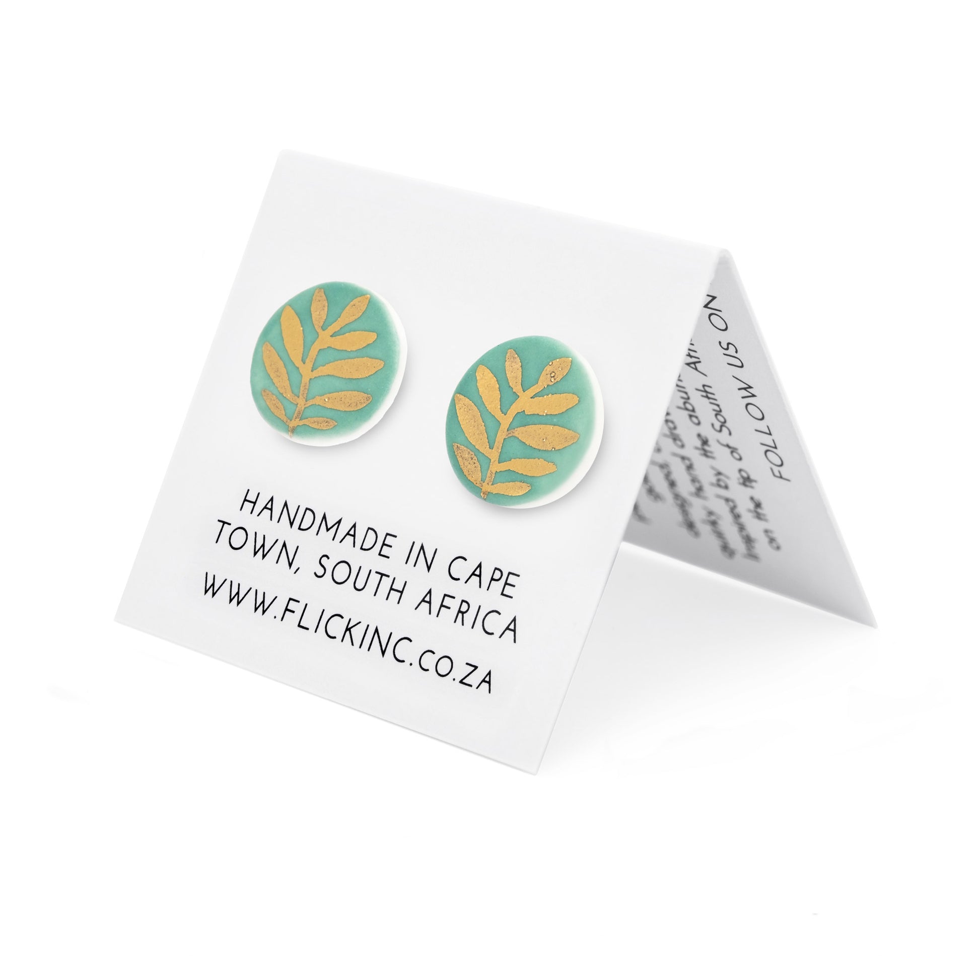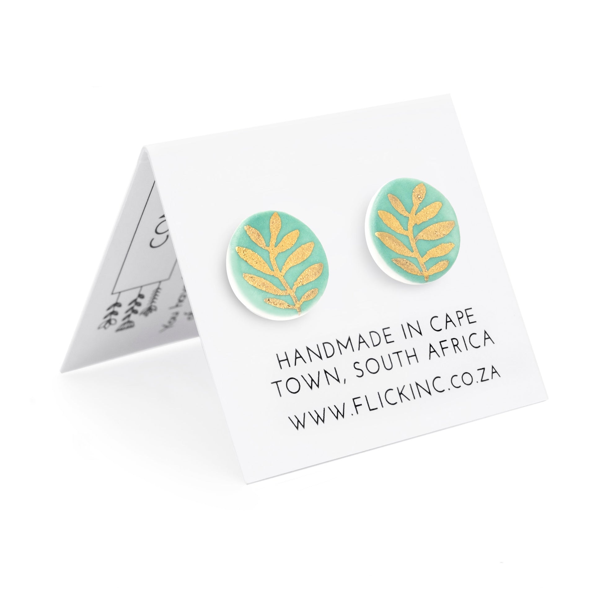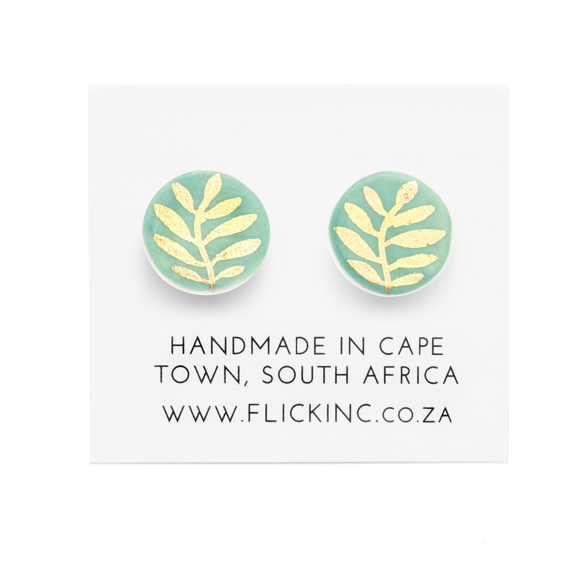 These handcrafted porcelain studs are a fresh and modern accessory. Each earring features a mint-green glaze with a striking, hand-painted gold leaf. The crisp color and clean botanical pattern make them a versatile piece that effortlessly elevates any outfit. Lightweight and comfortable for all-day wear, these earrings are handmade in Cape Town, South Africa.