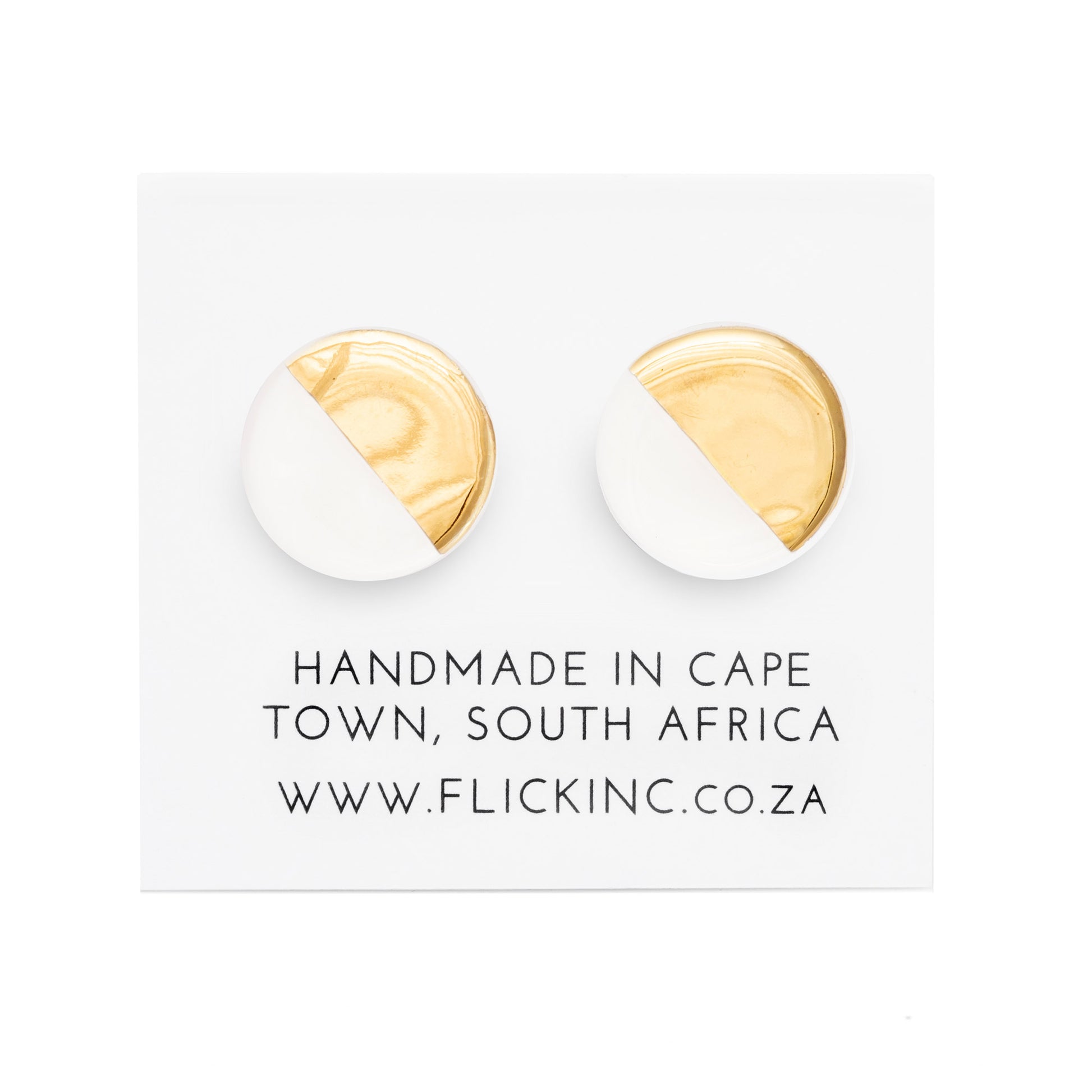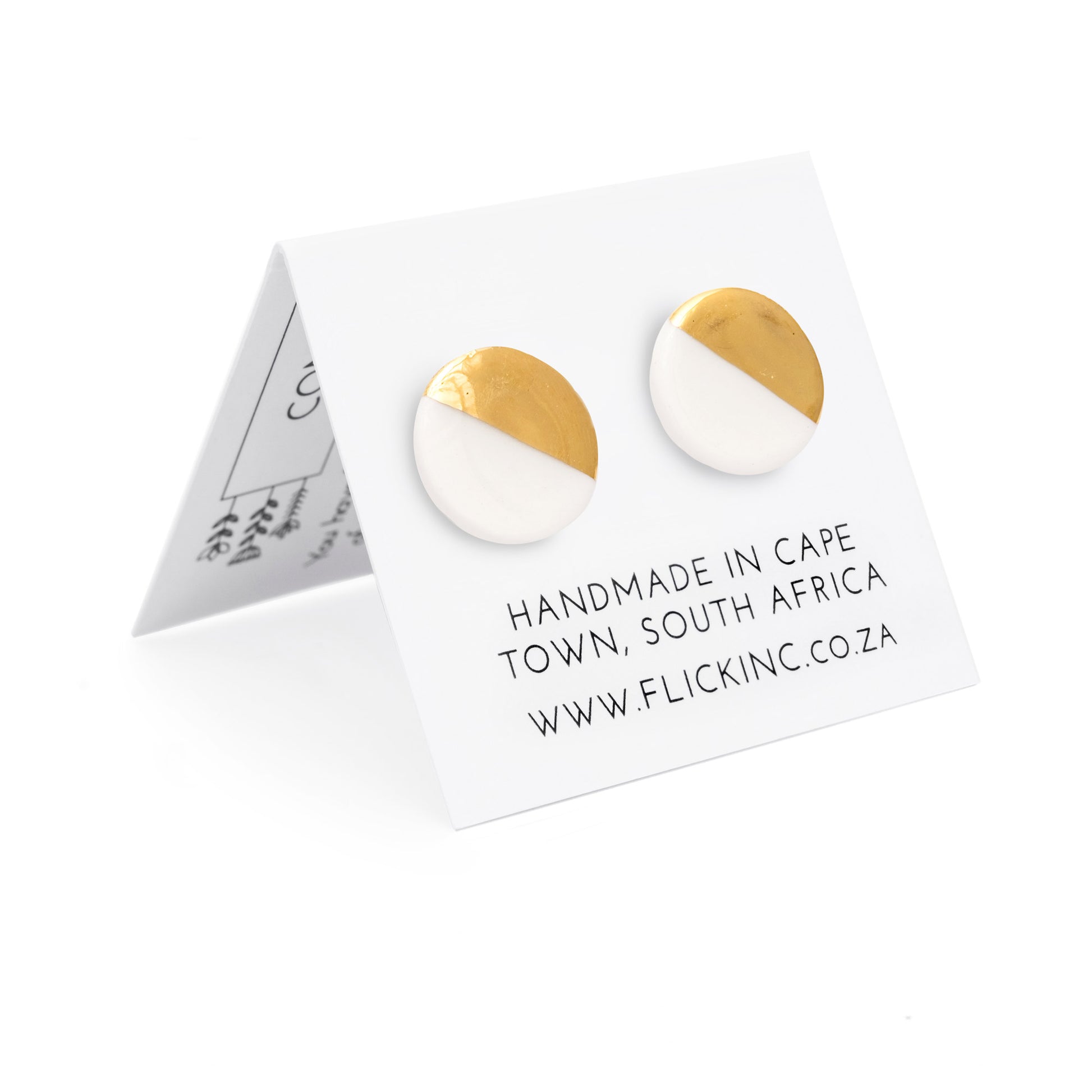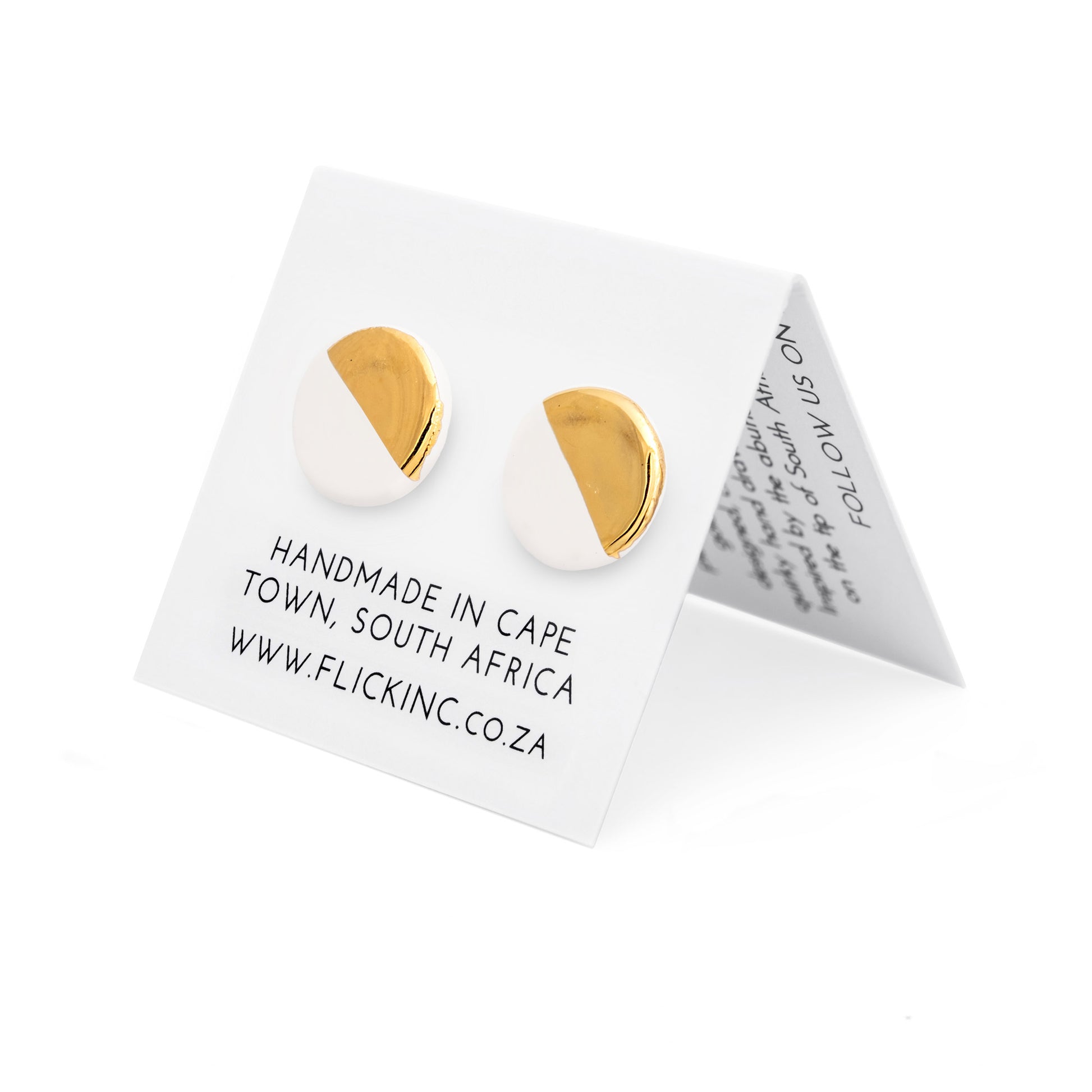 Our Heaven and Earth studs feature black porcelain that is hand-rolled, cut, and fired to perfection. Adorned with hand-painted fine glaze and 22kt gold luster, these earrings combine exquisite artistry with a touch of elegance. Perfect for adding a unique and sophisticated flair to any outfit, the Heaven and Earth studs embody a harmonious balance between the celestial and the terrestrial.