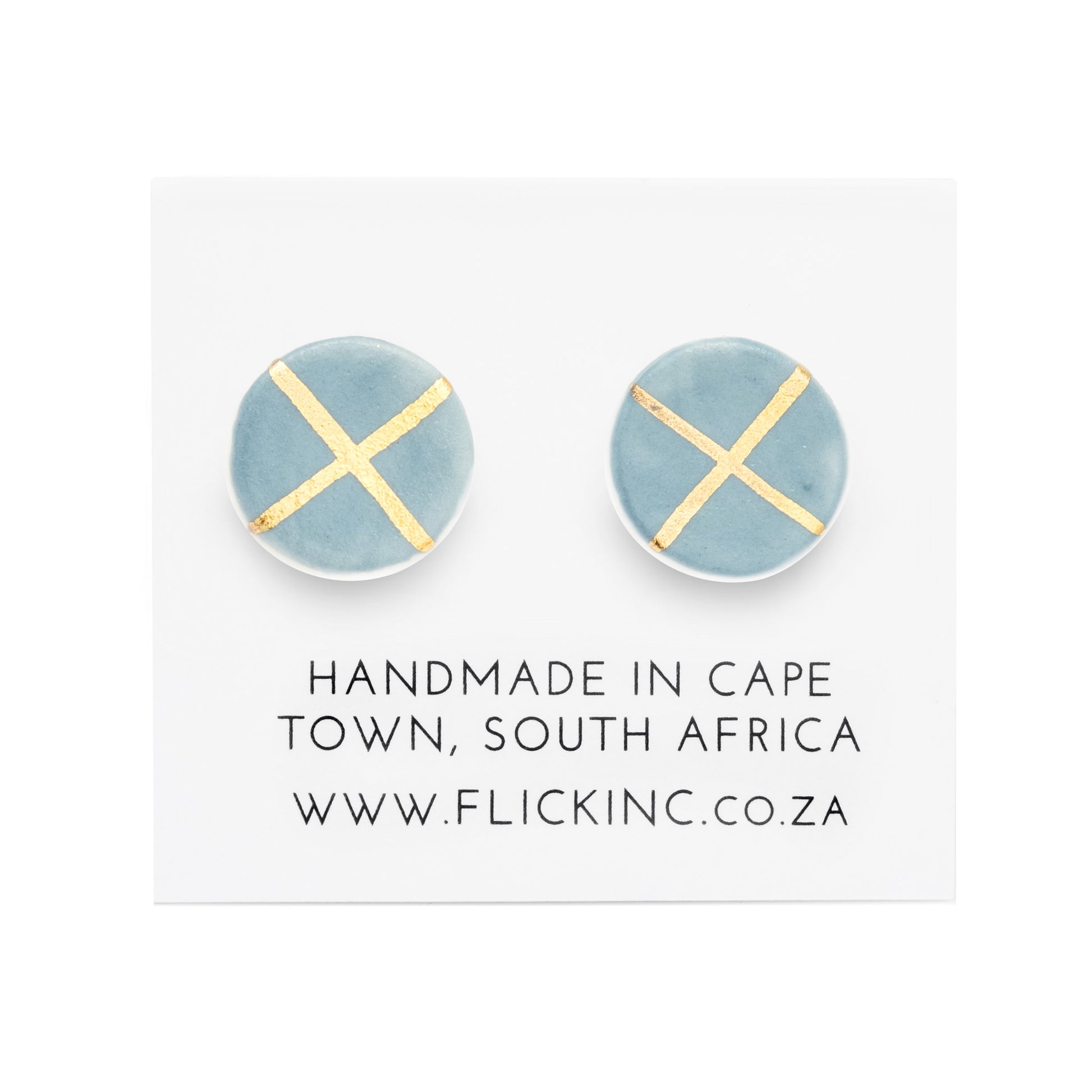 Our Horizon Blue Golden studs are meticulously crafted from hand-rolled white porcelain. Against a beautiful dusty blue glaze, each earring is adorned with a hand-painted 22kt gold luster cross, creating a clean and striking geometric pattern. The simple design makes them a versatile and modern addition to any jewelry collection.