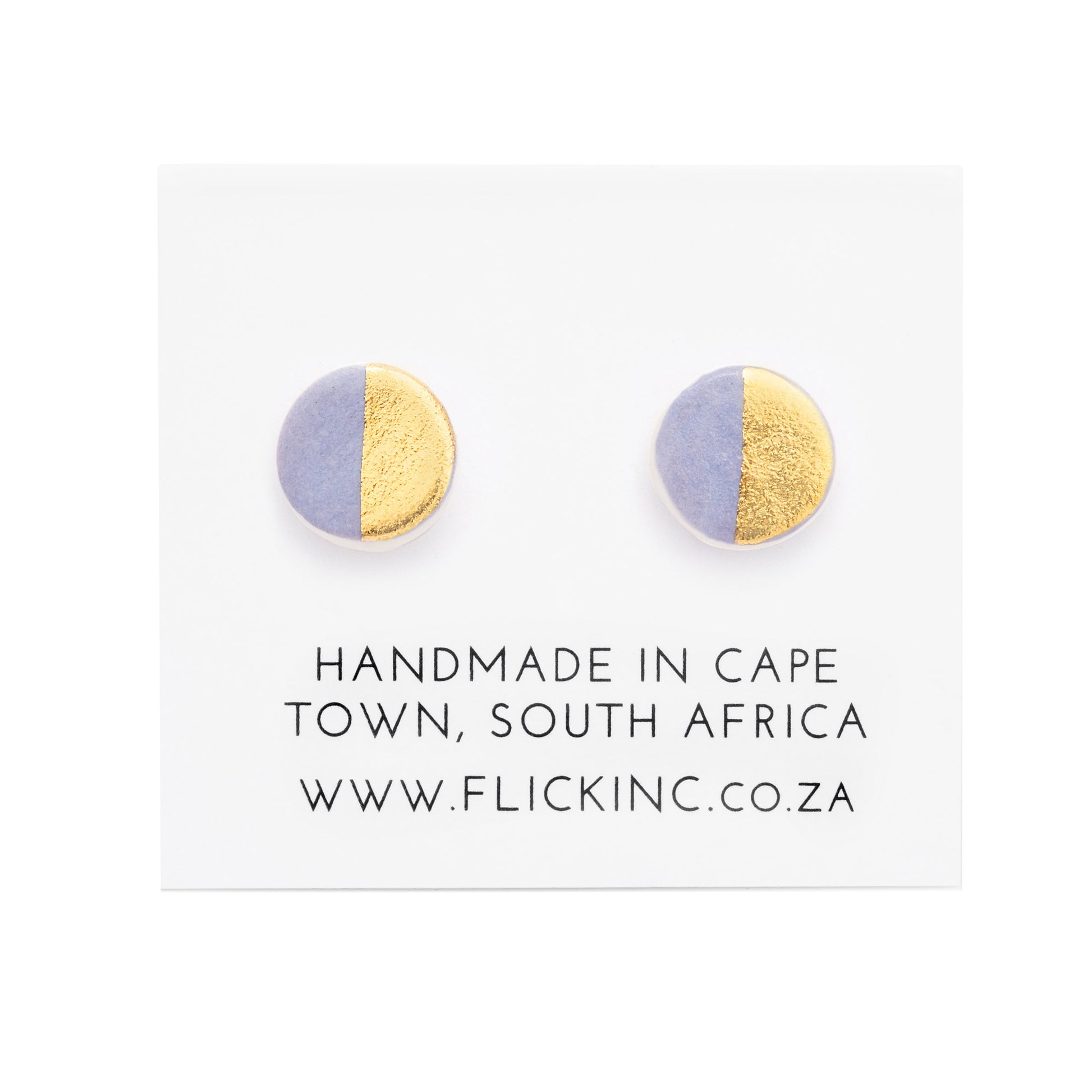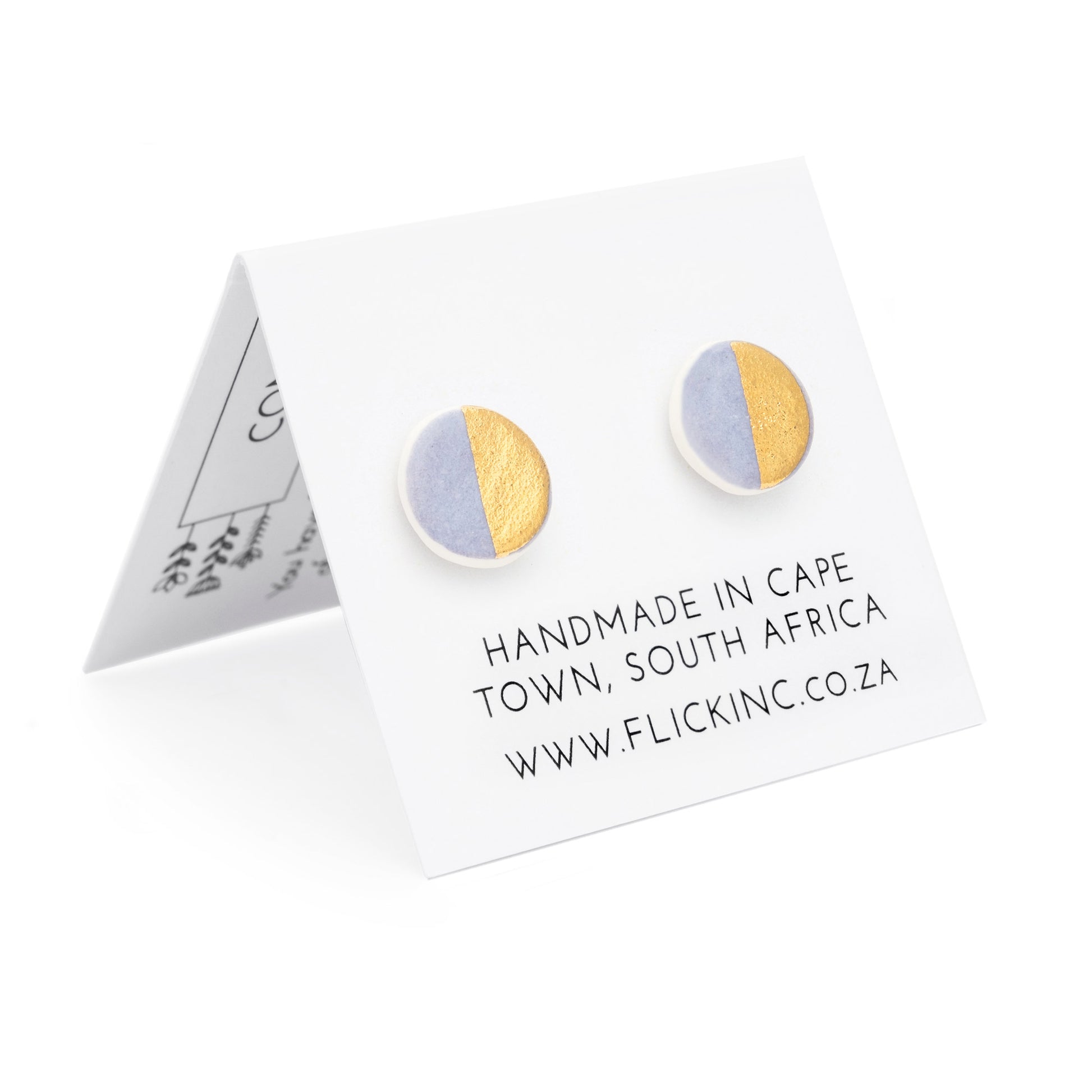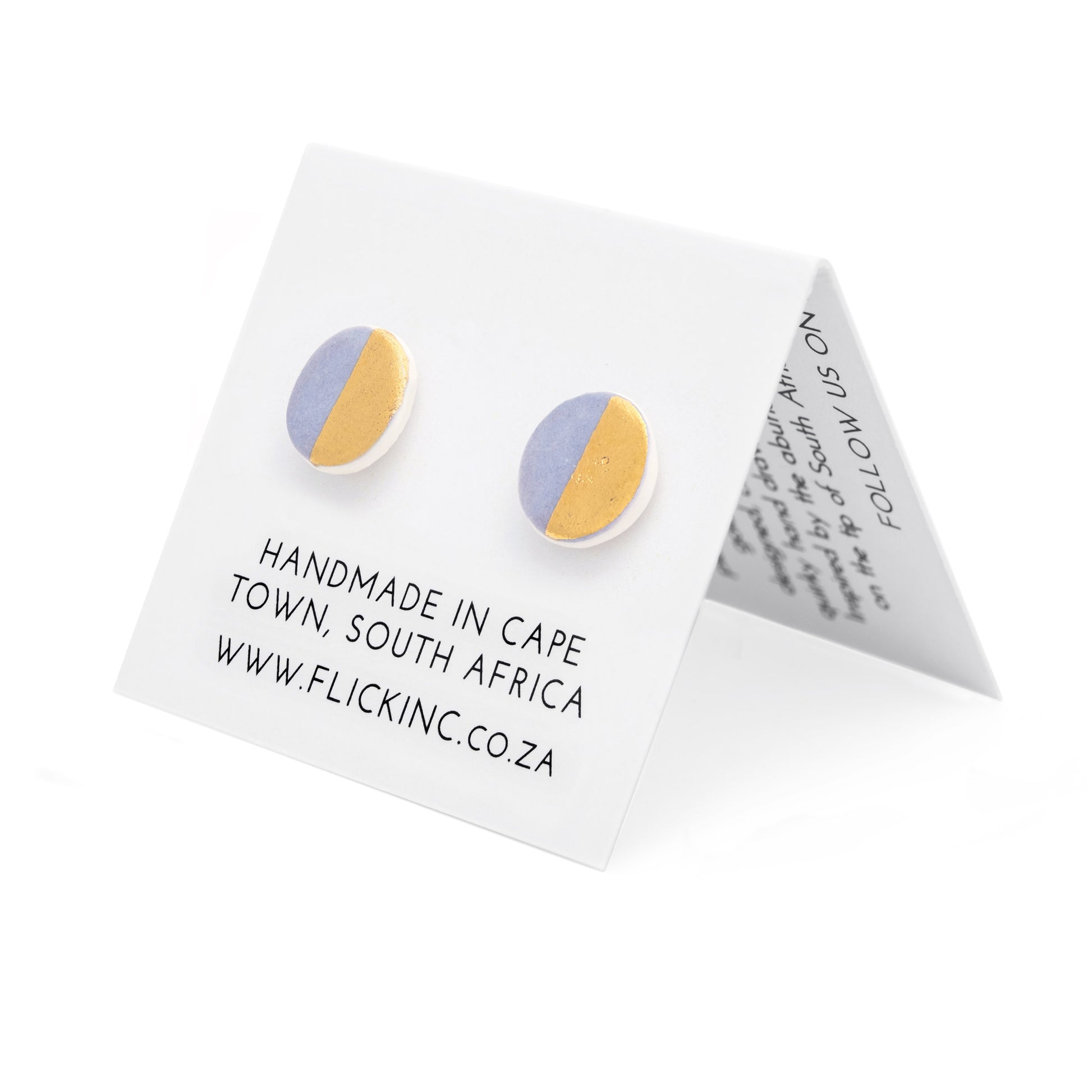 These handcrafted porcelain stud earrings are a study in refined contrast. Each small, circular earring features a delicate pastel lilac glaze on one half and a rich, textured gold finish on the other. The two halves meet in a clean, perfect line, creating a striking half-moon design. Lightweight and versatile, these earrings are designed to add a touch of modern elegance to any outfit. Handmade with care in Cape Town, South Africa, they are a unique and stylish accessory for any occasion.