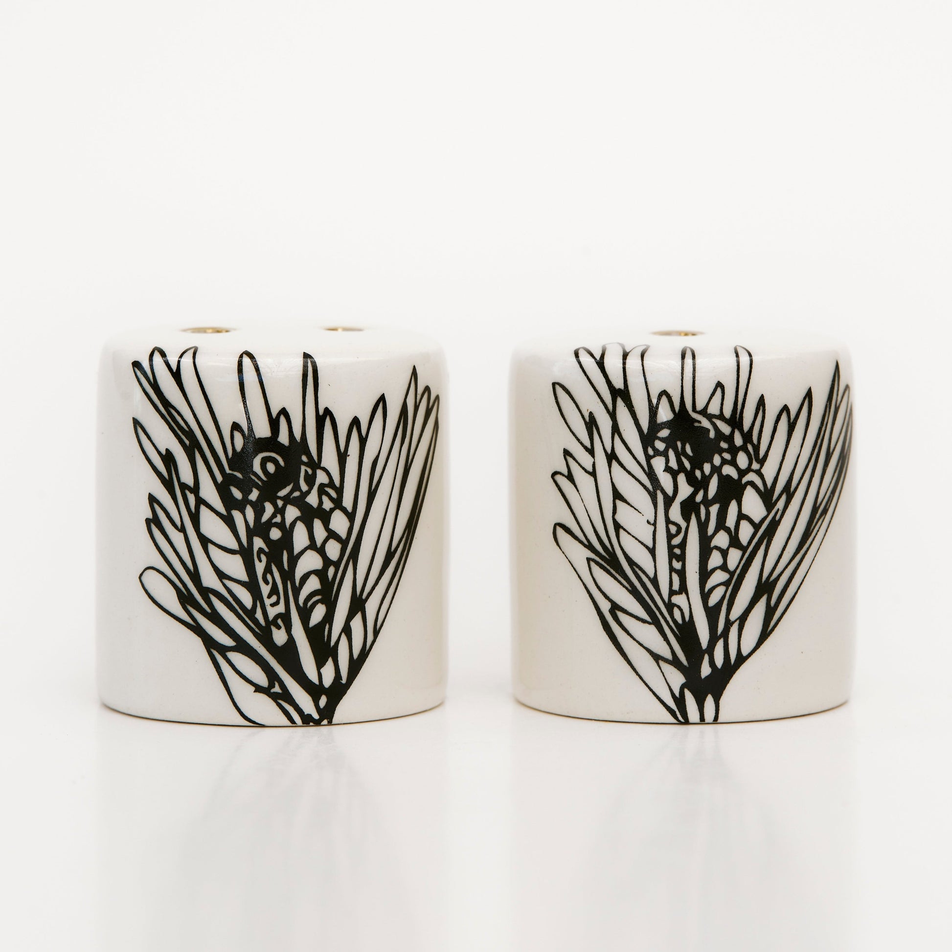 Elevate your dining table with our Salt and Pepper Shakers – Protea Wonder, featuring a captivating illustration of the iconic protea flower. Handcrafted in Cape Town, South Africa, these shakers blend whimsical design with practical functionality, bringing a touch of South African botanical beauty and a sense of wonder to your meals.