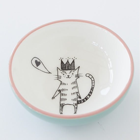 Small bowl with a whimsical Cat with Crown illustration. Handmade in Cape Town, South Africa, it adds charm to any setting. Perfect for snacks, dips, or as a stylish holder for small treasures.