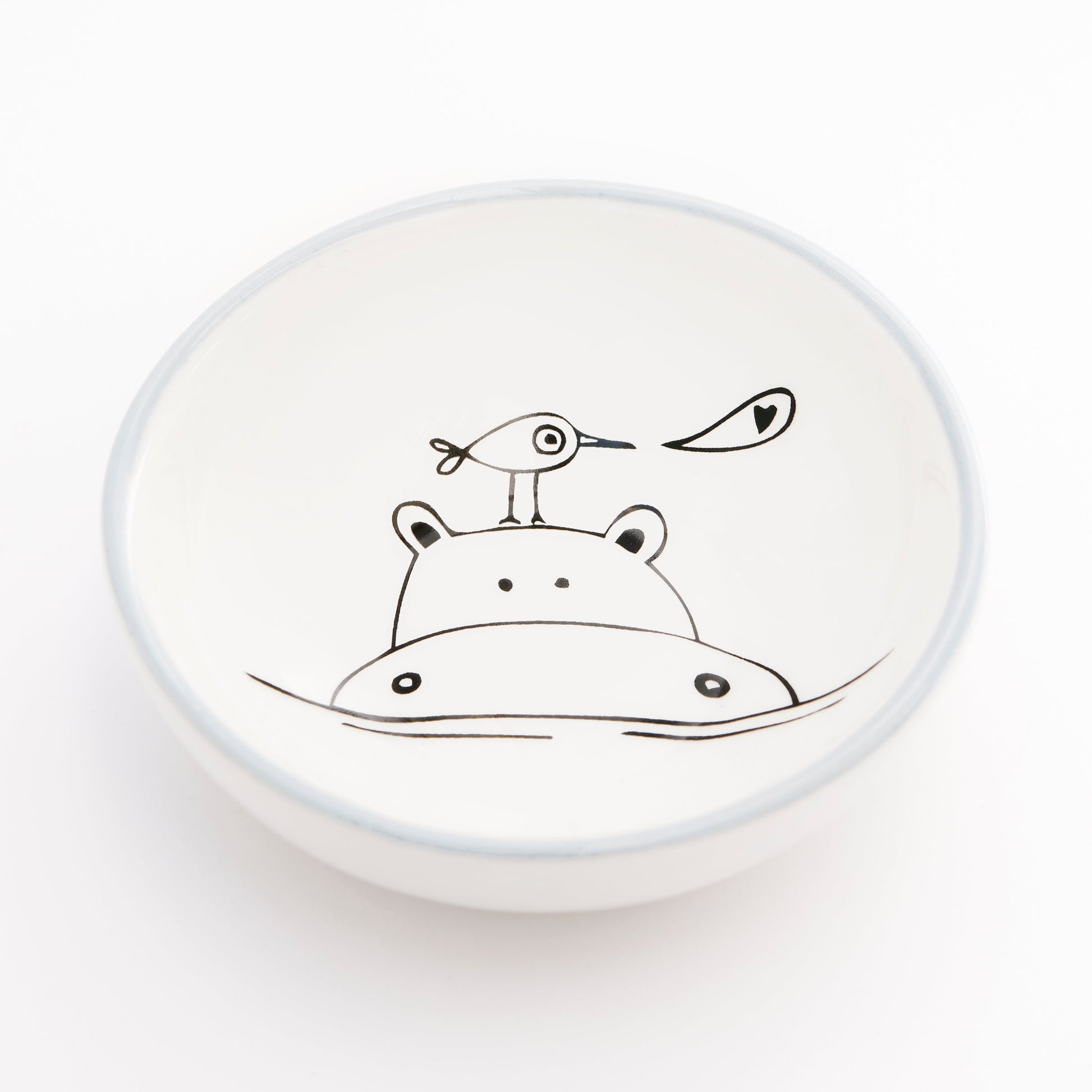 Add a touch of whimsy to your collection with our Hippo with Bird small bowl, handmade in Cape Town, South Africa. Featuring a sweet illustration of a small hippo with its little birdy friend, this charming bowl is perfect for serving snacks, dips, or condiments. It also makes a delightful holder for rings, small change, or earrings, combining playful elegance with functionality in your daily routine.
