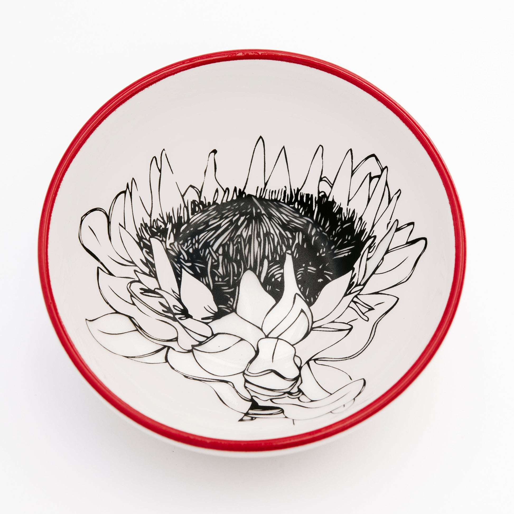 Celebrate the beauty of South Africa with our King Protea small bowl, handmade in Cape Town. Featuring a stunning illustration of the iconic King Protea with a striking red rim, this bowl is perfect for serving snacks, dips, or condiments. It also makes a charming holder for rings, small change, or earrings, combining floral elegance with practical functionality.
