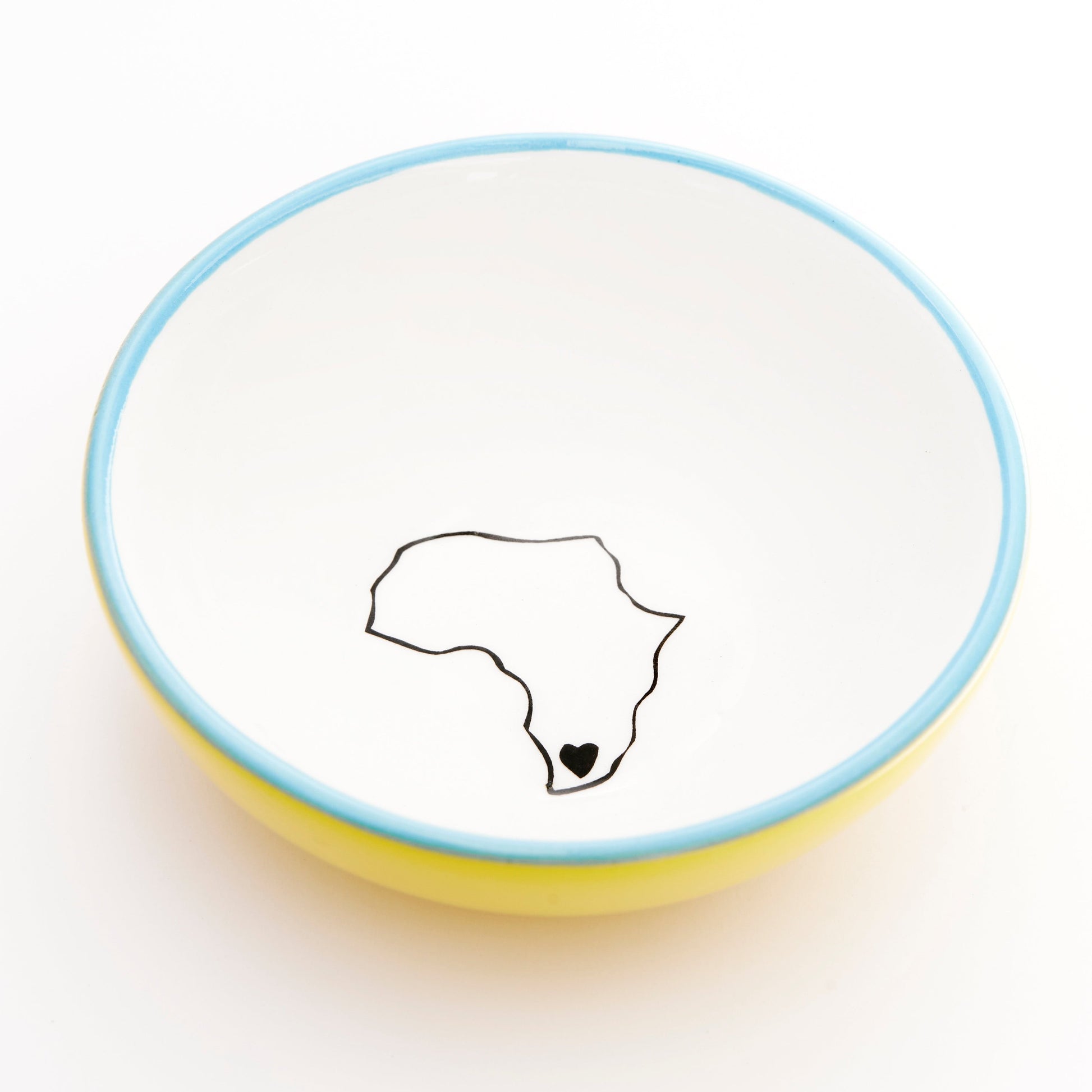 Celebrate a touch of Africa at home with this cute little bowl, handmade in Cape Town, South Africa. Featuring an illustration of the African continent with a small heart marking South Africa, this bowl is perfect for serving snacks, dips, or condiments. It also serves as a charming holder for rings, small change, or earrings, adding a meaningful touch of elegance and functionality to your everyday routine.