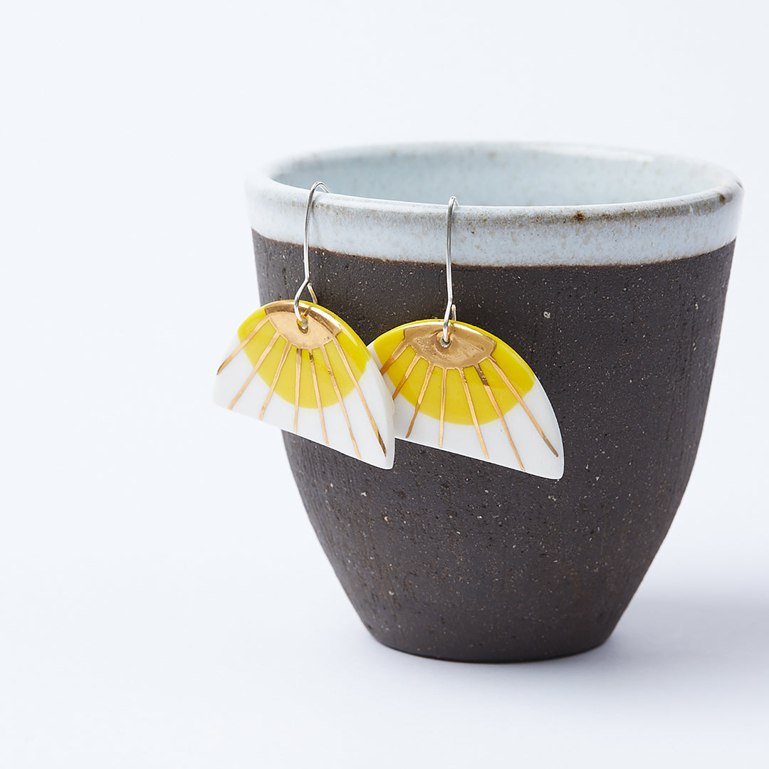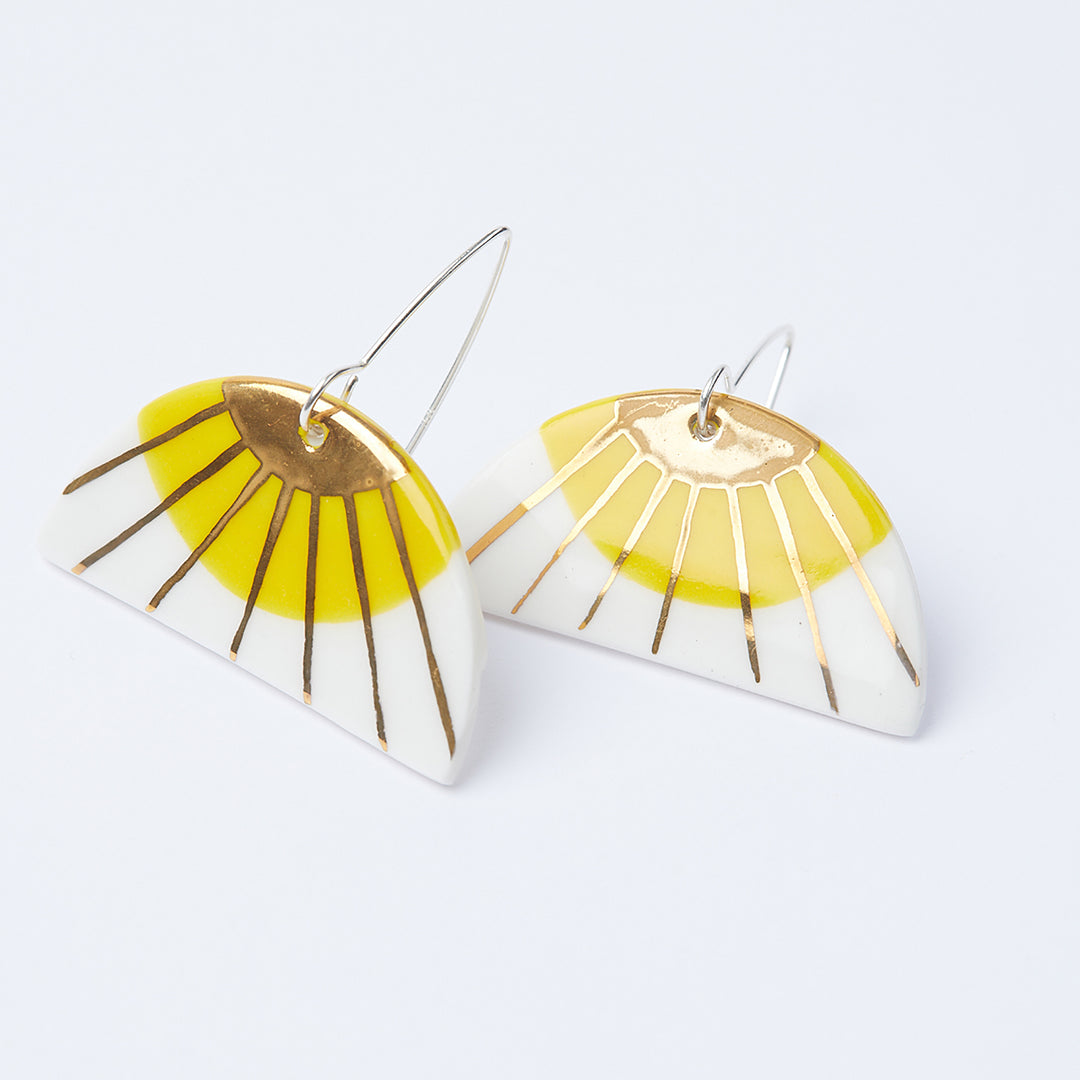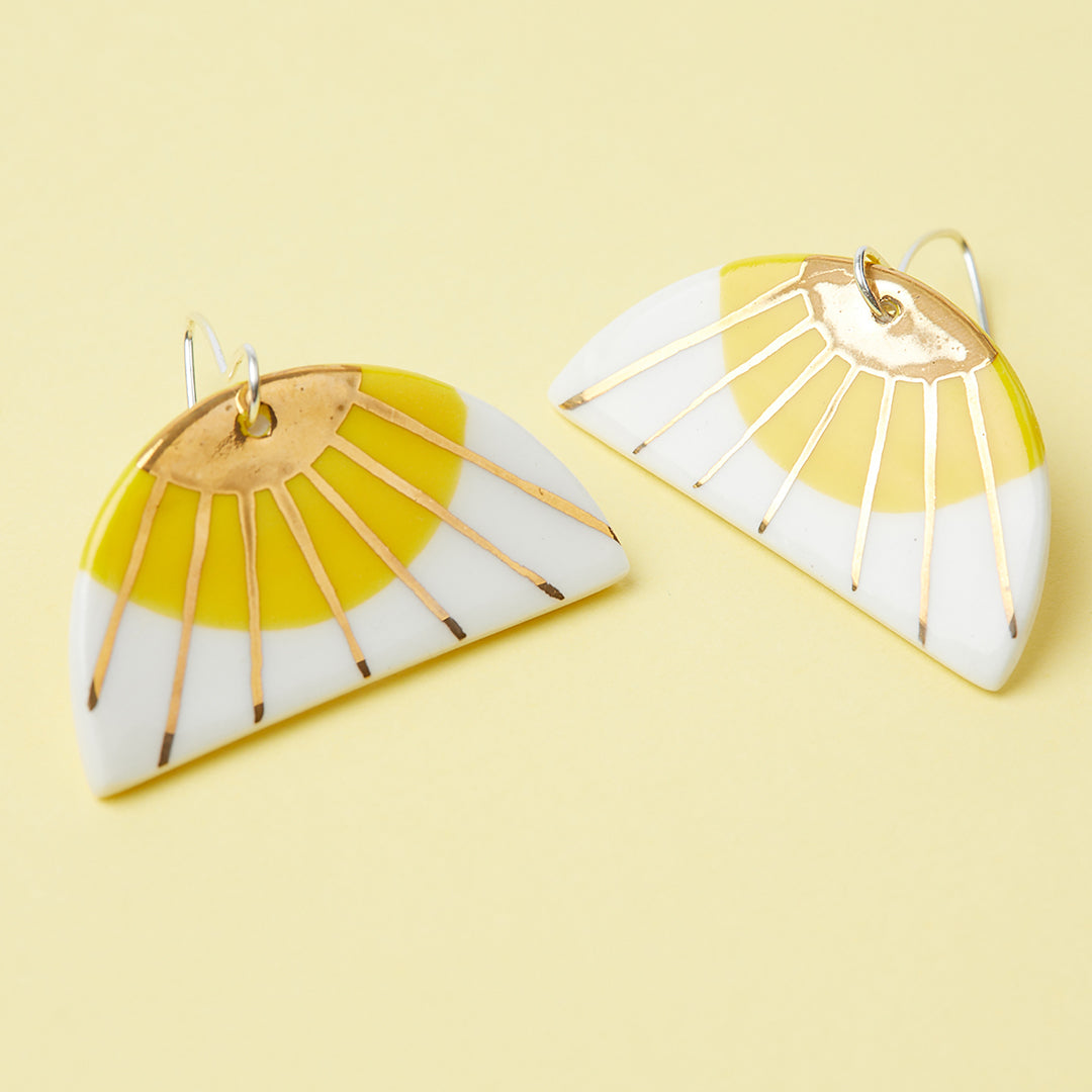 Add a vibrant touch to your outfit with these porcelain Sunburst earrings. The hand-drawn pattern features a bold yellow and gold sunburst design on a white background. Handmade in Cape Town, South Africa, they have a comfortable fan-like shape that is both stylish and unique.