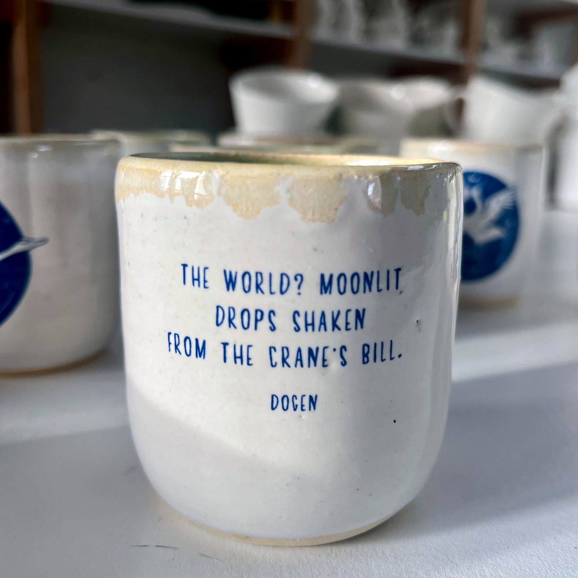 Handcrafted in Cape Town, South Africa, this hand-thrown Windhorse ceramic cup features a standing crane and a Zen verse by Dōgen: